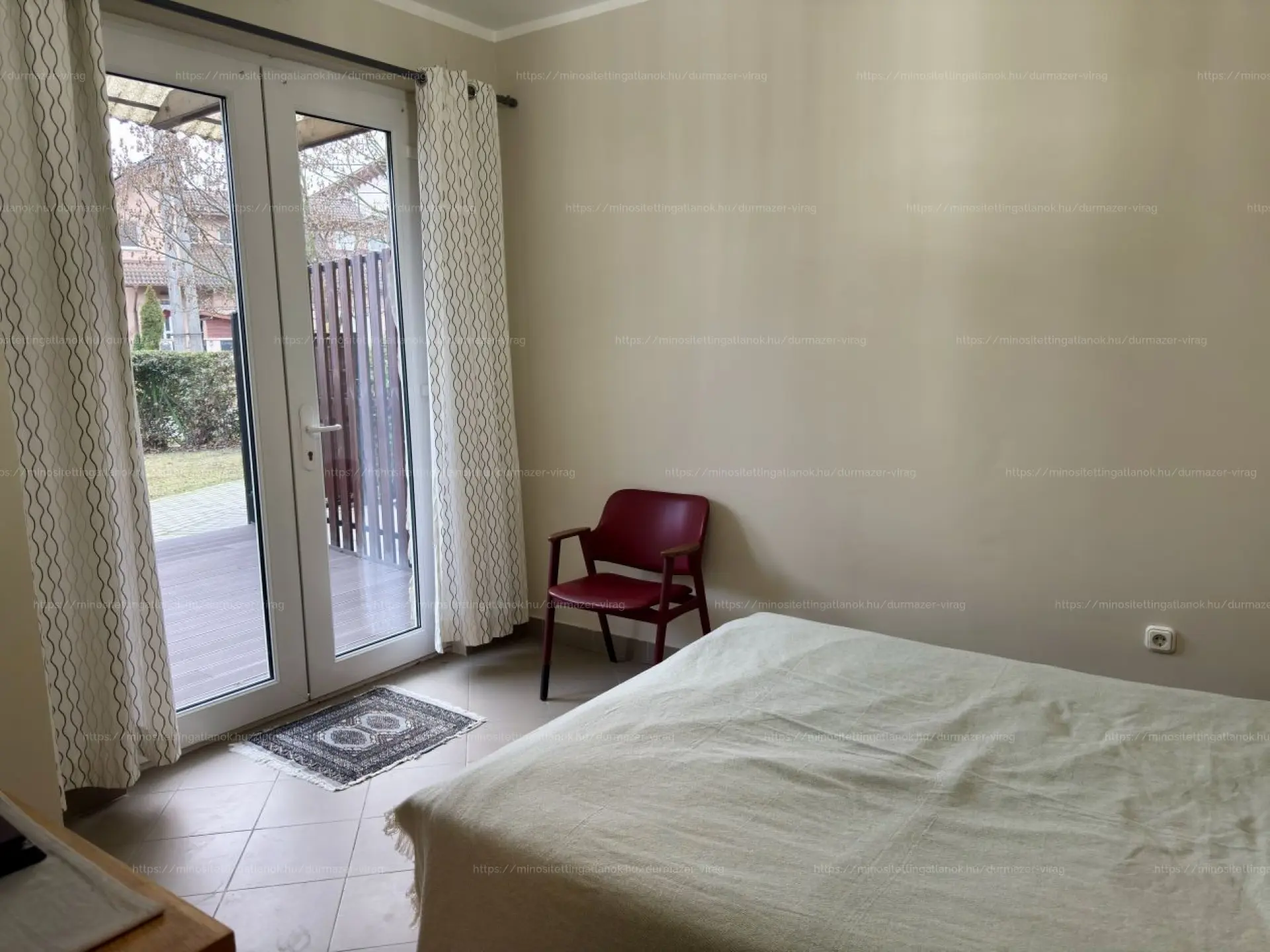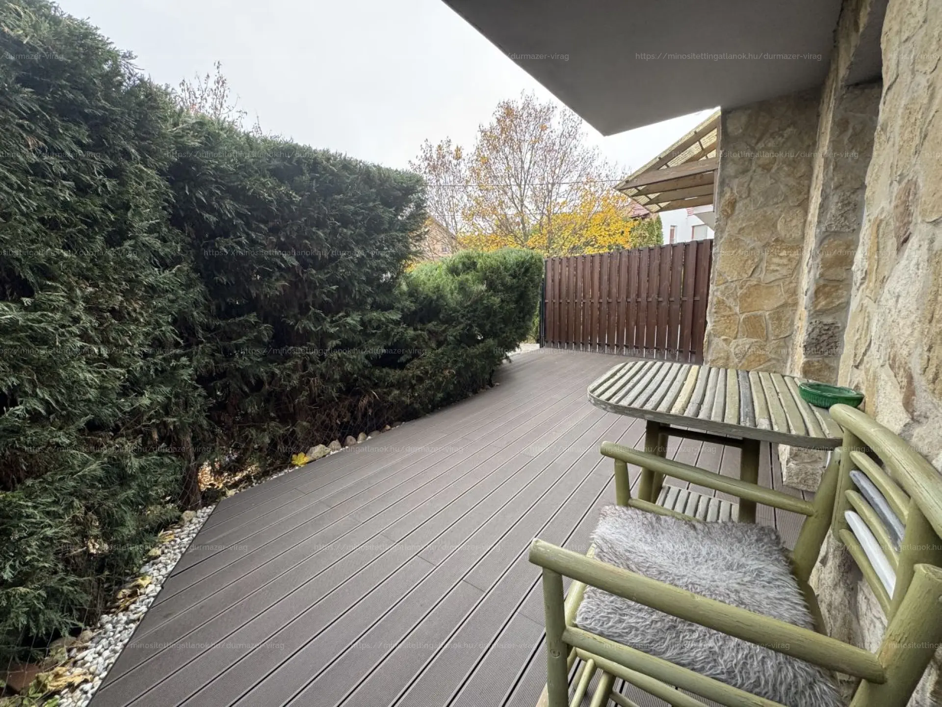 30 m²-es, teljesen privát terasz, zöld sövénnyel körbevett, a hálószobából közvetlen kijárattal