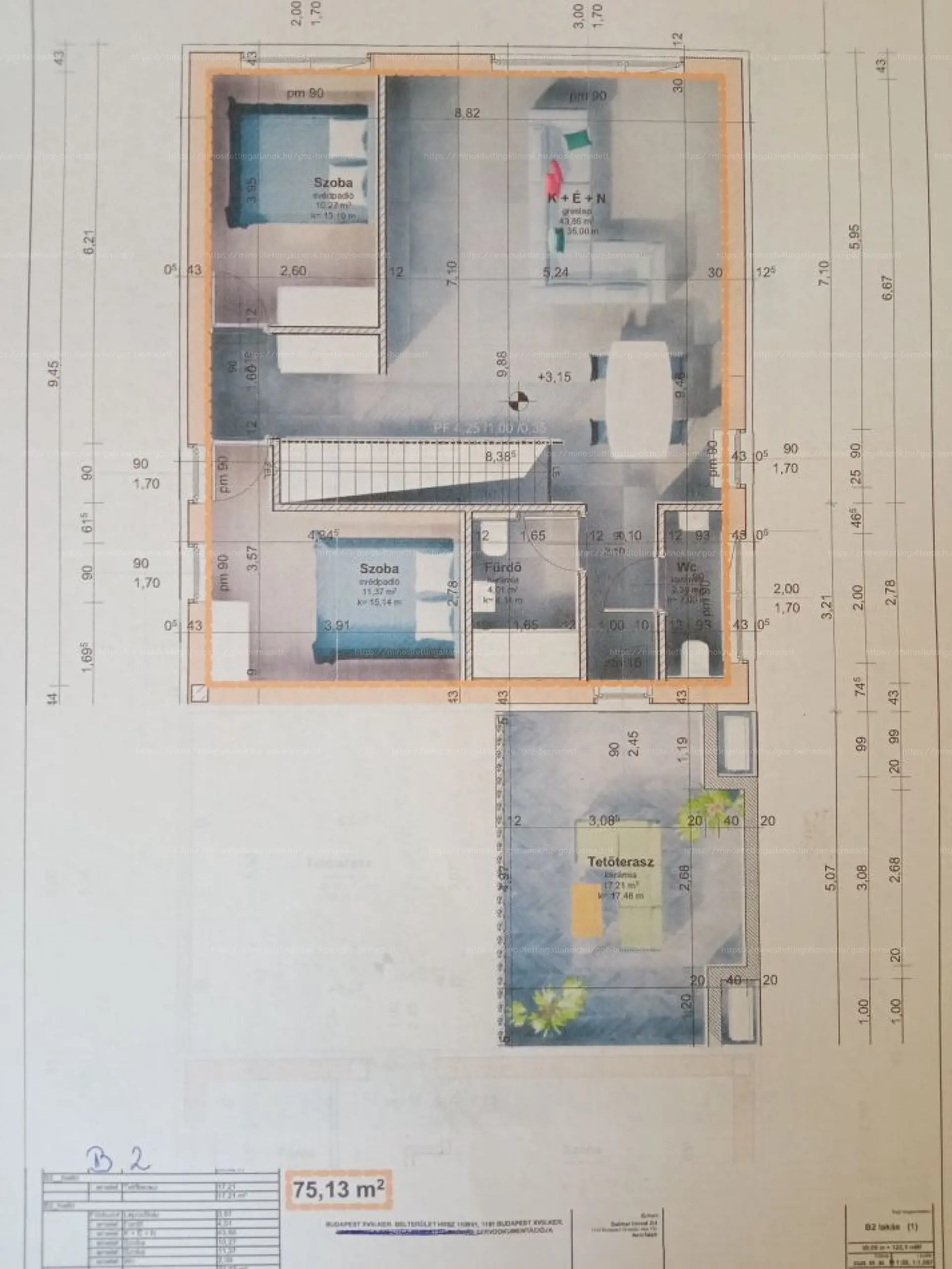 -B2 Lakás 75m2 + 17m2 Tető Terasz ( Nappali-Konyha + 2 Háló + Fürdő + Vendég Wc + Tető Terasz 17nm.) - 99.99mFt