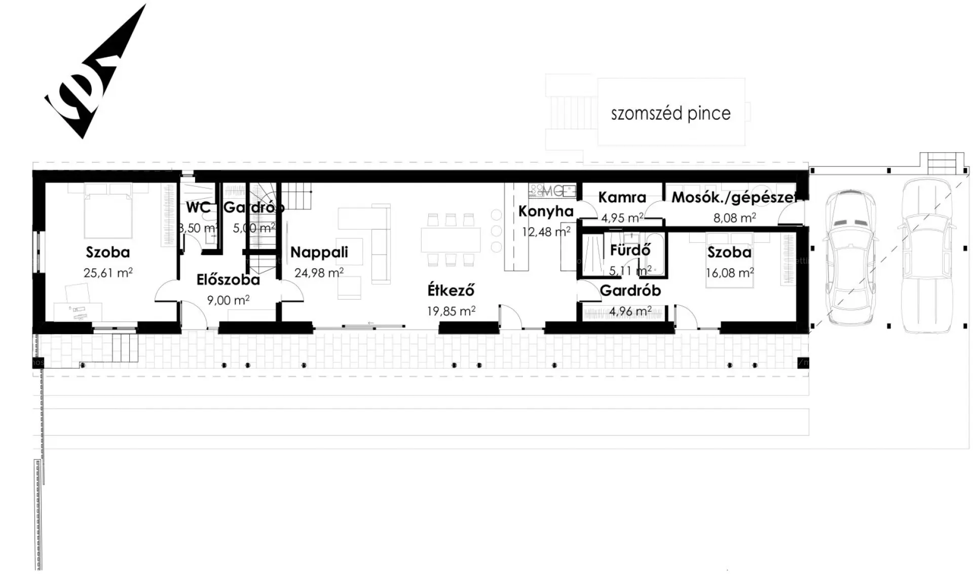 Az ingatlan összesen 4 hálószobával, valamint egy nagyméretű, galériás nappali–étkező–konyha térrel rendelkezik. A ház előtt végigfutó tornácról érkezünk a bejárati előtérbe, ahonnan vendégfürdő, gardrób és egy földszinti hálószoba nyílik. A központi elhelyezkedésű, nagy belmagasságú nappali–étkező–konyha tér a ház valódi közösségi tere, amelyből közvetlen kapcsolat nyílik a kert irányába.
