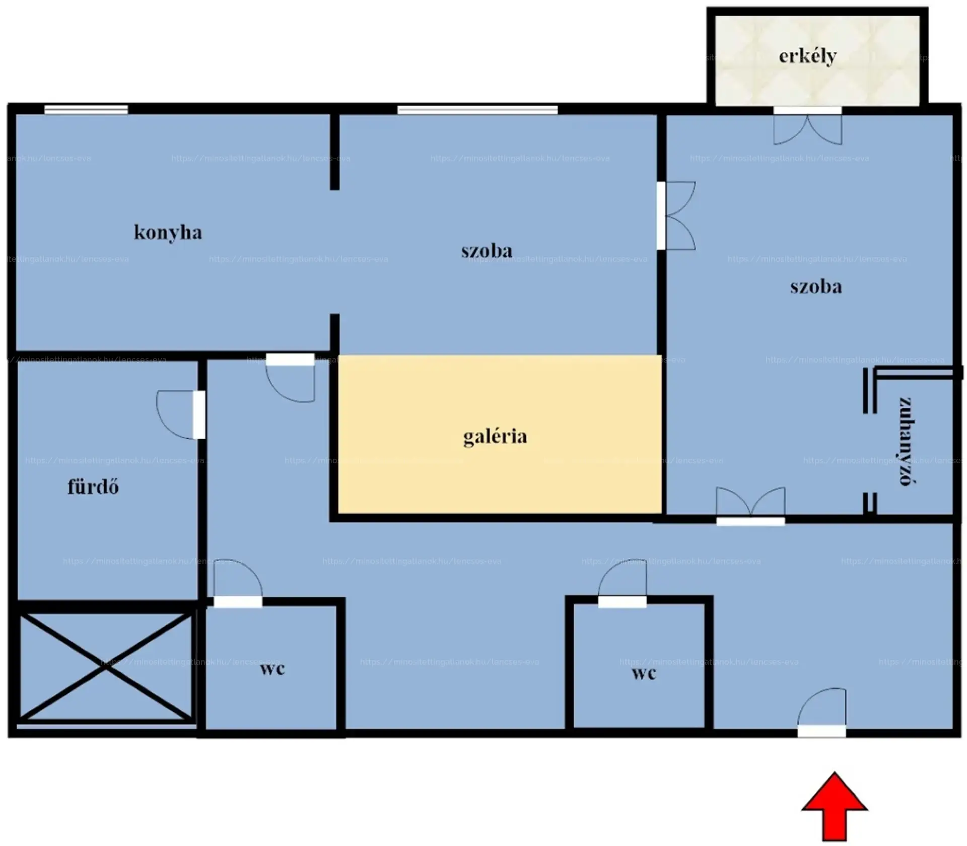 - Beosztás: 2 szoba + galéria, DUPLAKOMFORT, 2 külön WC, konyha, előszoba
