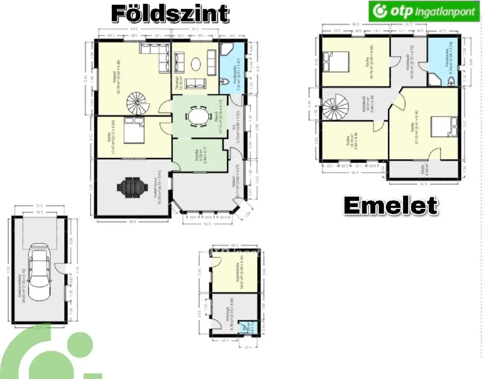 A telken több melléképület is rendelkezésre áll: egy bőséges alapterületű, elektromos kapuval működő garázs, amely méretéből adódóan műhely kialakítására is készült; egy könnyűszerkezetes tároló; egy külön nyárikonyha; valamint egy önálló, WC-vel ellátott "dühöngő" helyiség, amely hobbiszobaként vagy vendégtérként is funkcionálhat.
