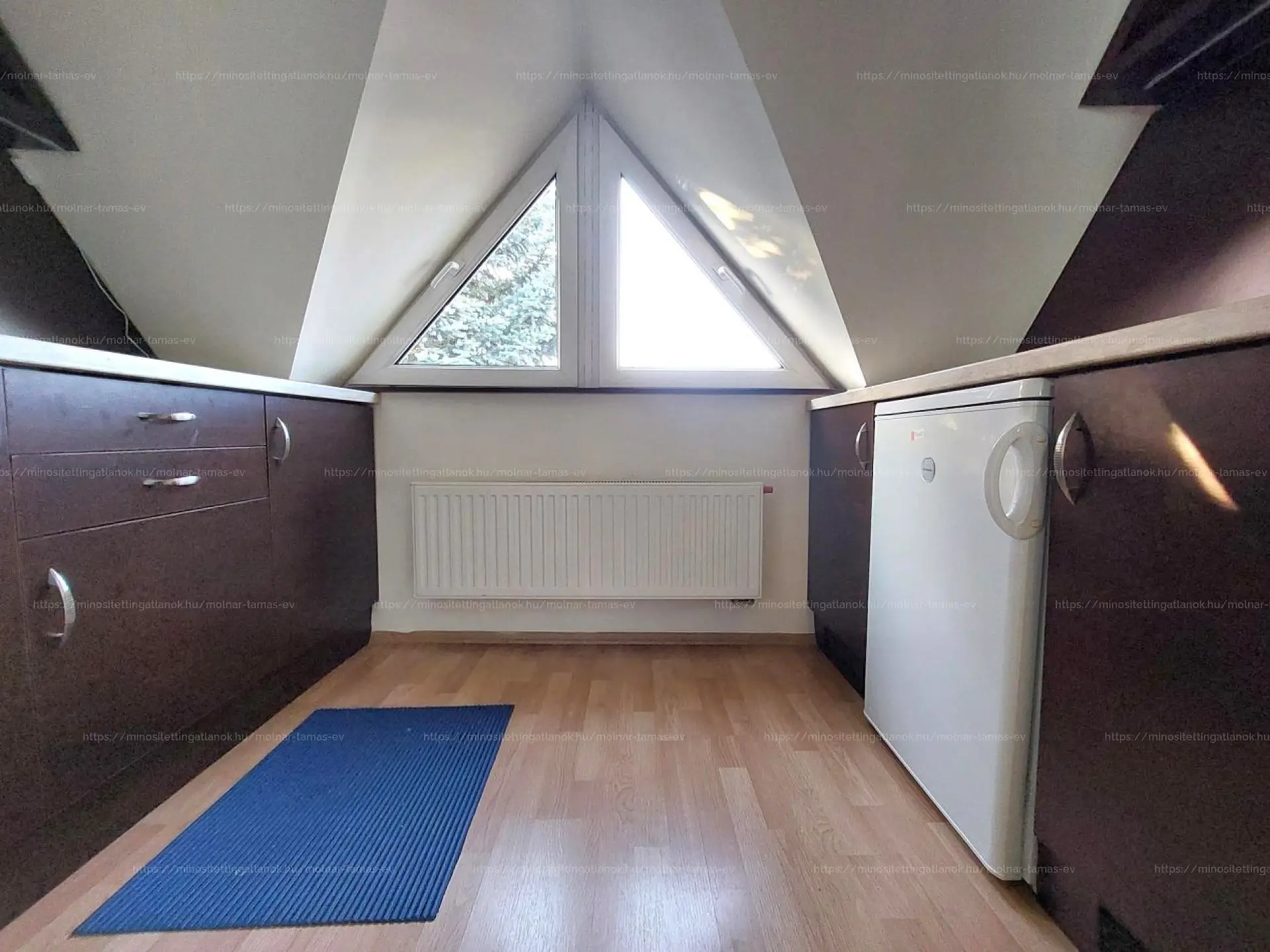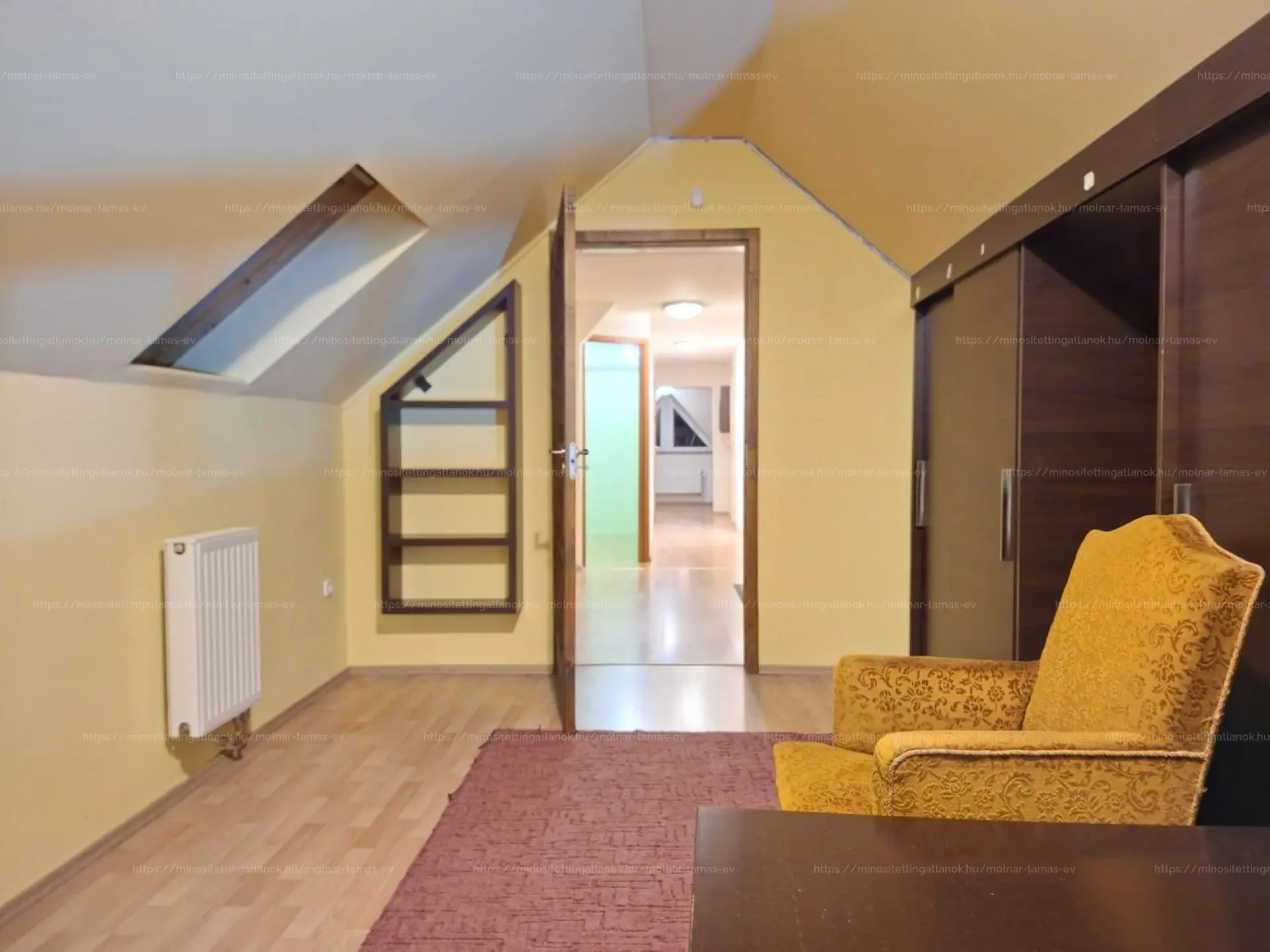 A tetőtérbe igényes, robosztus, natúr falépcsőn érünk fel, ahol összesen 4 szoba (2 nagyobb és 2 kisebb alapterületű) található, amelyekből igény szerint további dolgozószoba/tanulószoba/vagy gardrób is kialakítható. A szobákban érdemes lehet a tetőhajlatokat tárolószekrényekkel beépíteni, hogy a teret még jobban ki lehessen használni.