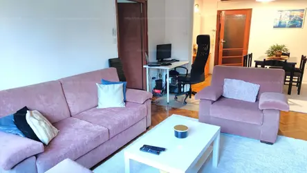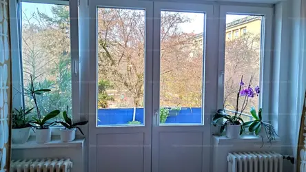Mindkét szoba szép zöld parkra néz, a nappalihoz erkély tartozik. Az ablakok 3 rétegűek, elektromos redőnnyel felszereltek. A nappali ülőgarnitúrával és szekrénysorral berendezett. A képeken látható TV és dohányzó asztal a jelenlegi bérlő tulajdona, másik dohányzó asztal lesz helyette.