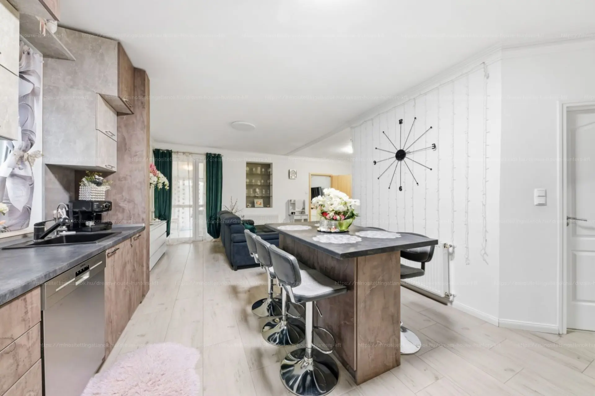 A nagyméretű, fényes nappali–étkező–konyha egybenyitott élettere a családi élet középpontja. A mennyezetig érő, lenyűgöző, teljesen gépesített konyhabútor nem csak lenyűgöző, hanem elképesztően praktikus is — valóságos álom minden kulináris művész számára.
