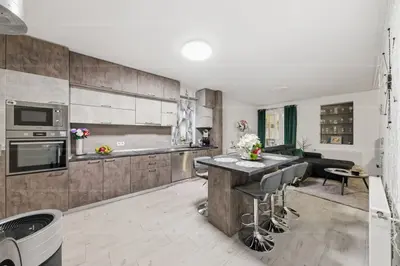 A nagyméretű, fényes nappali–étkező–konyha egybenyitott élettere a családi élet középpontja. A mennyezetig érő, lenyűgöző, teljesen gépesített konyhabútor nem csak lenyűgöző, hanem elképesztően praktikus is — valóságos álom minden kulináris művész számára.
