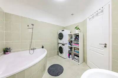 A fürdőszobában sarokkád a pihentető fürdőért, mellette külön mellékhelység növeli a kényelmet.