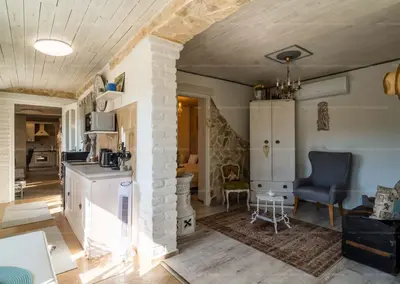A falak részben tapétával burkoltak, amik jól illeszkednek a belső bútorokhoz.