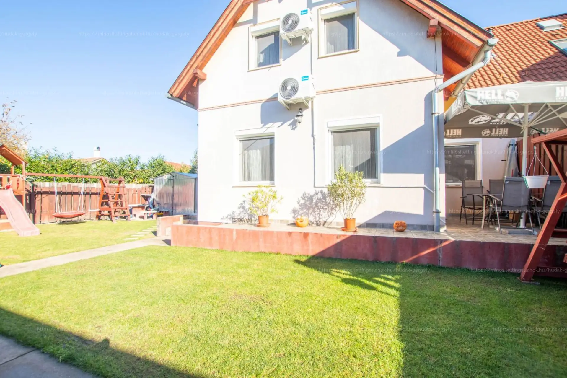 A kert jól elszeparált, itt egy szép méretű, hőszivattyús, azaz fűthető úszómedence, kis játszótér, mozgatható kerti tároló, grillezésre alkalmas hely lett kialakítva, a kertbe több gépkocsi számára beálló.