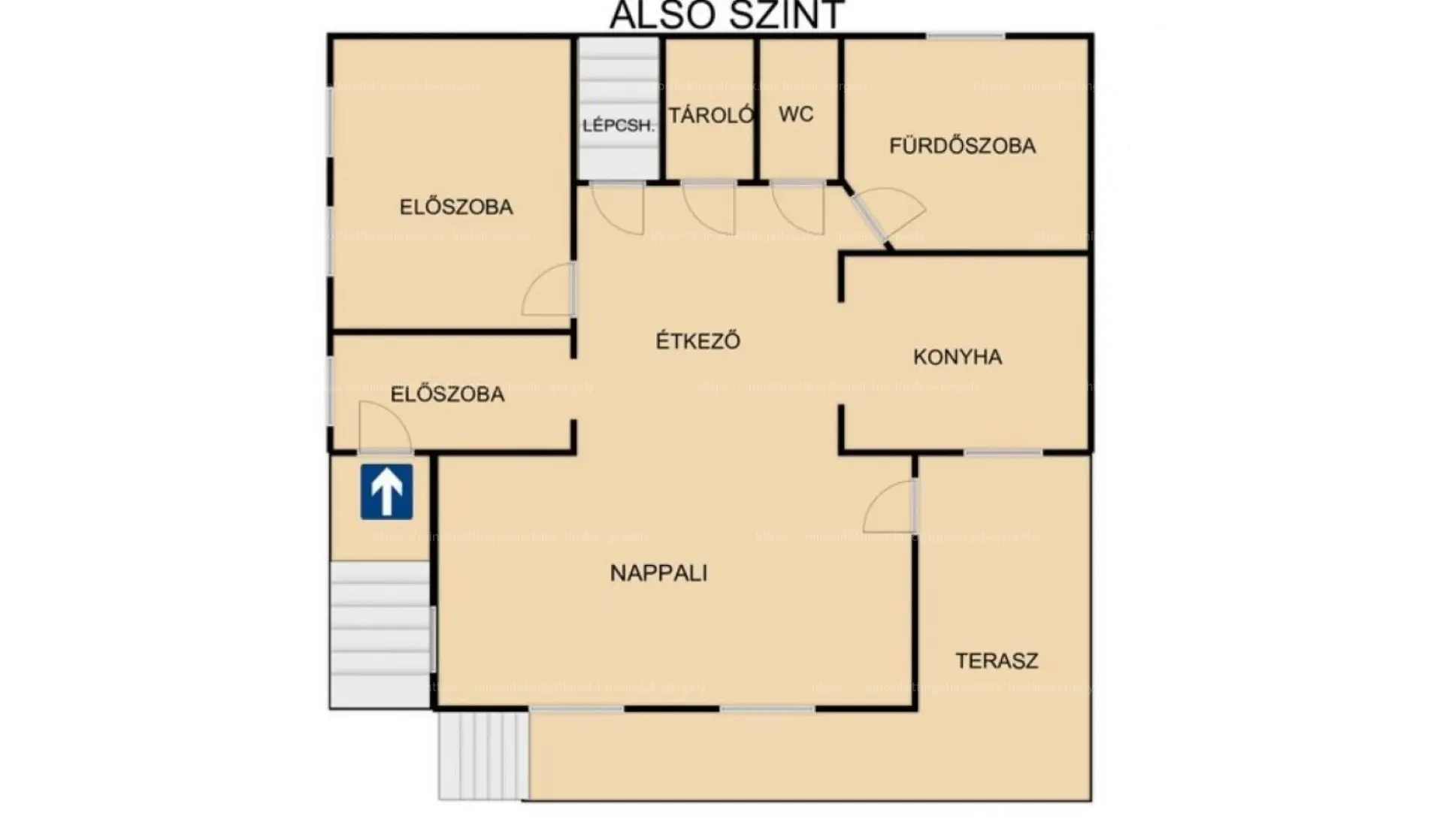 Szobák az alsó szinten: nappali, étkező, konyha, hálószoba, kádas fürdőszoba, wc-mosdó, tároló, előszoba. A nappaliból terasz nyílik.