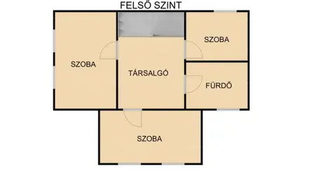 Felső szinten 3 külön nyíló hálószoba, melyből a két nagyobbik ketté osztható (az eredeti terveken ez szerepelt, így a felső szinten akár 5 hálószoba is gyorsan kialakítható), zuhanyzós fürdőszoba, társalgó helyiségek.