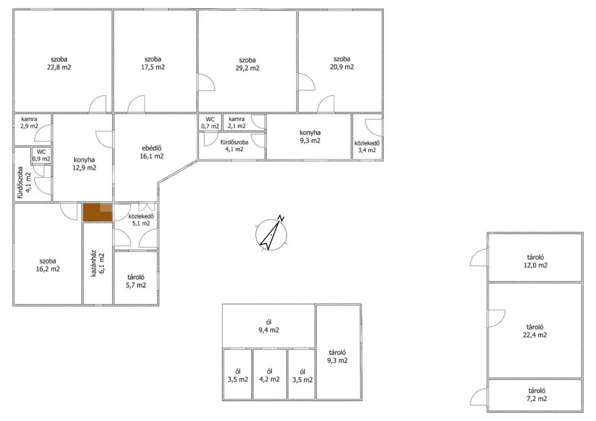 Az ingatlan két helyrajzi számon helyezkedik el, egy összesen több mint 1100 m²-es területen. A ház két lakrészre osztható: az egyik egy 70 m²-es, két szobás, míg a másik 110 m²-es, három tágas szobás otthont kínál. Minden lakrészhez saját fürdőszoba és mellékhelyiség tartozik, így a privát tér maximálisan biztosított akár összeköltözők számára is.