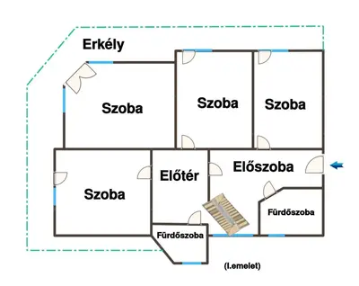 247 m² lakótér praktikus elrendezéssel: 4 különálló hálószoba, 2 teljes értékű fürdőszoba és 4 külön WC.