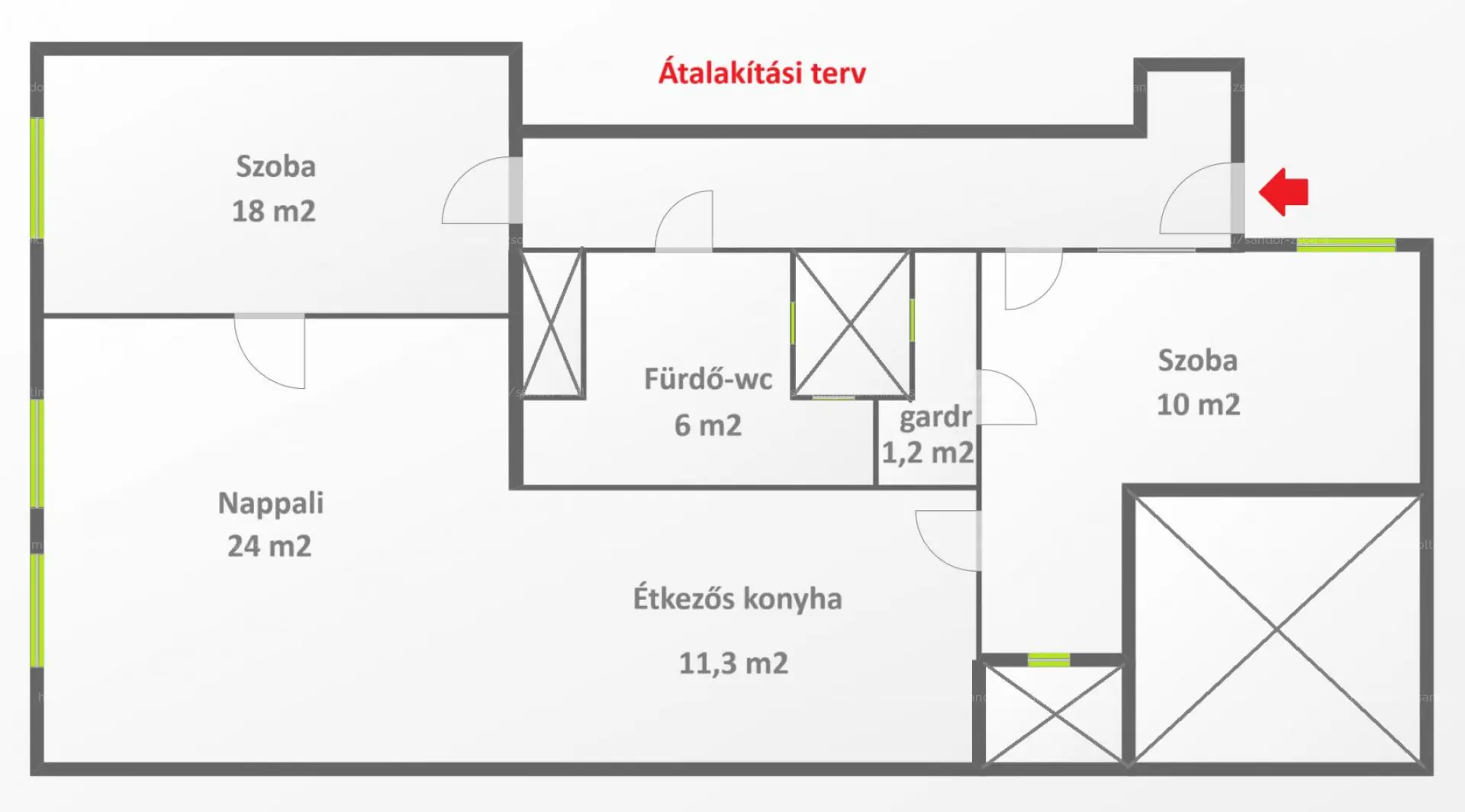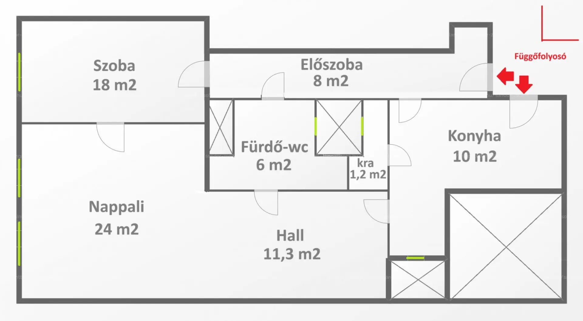 - A lakás 2 bejárattal rendelkezik, így igény esetén ketté is osztható, de a konyhai bejárat ablakra cserélésével egy remek elosztású, 3 szobás lakást kaphatunk.