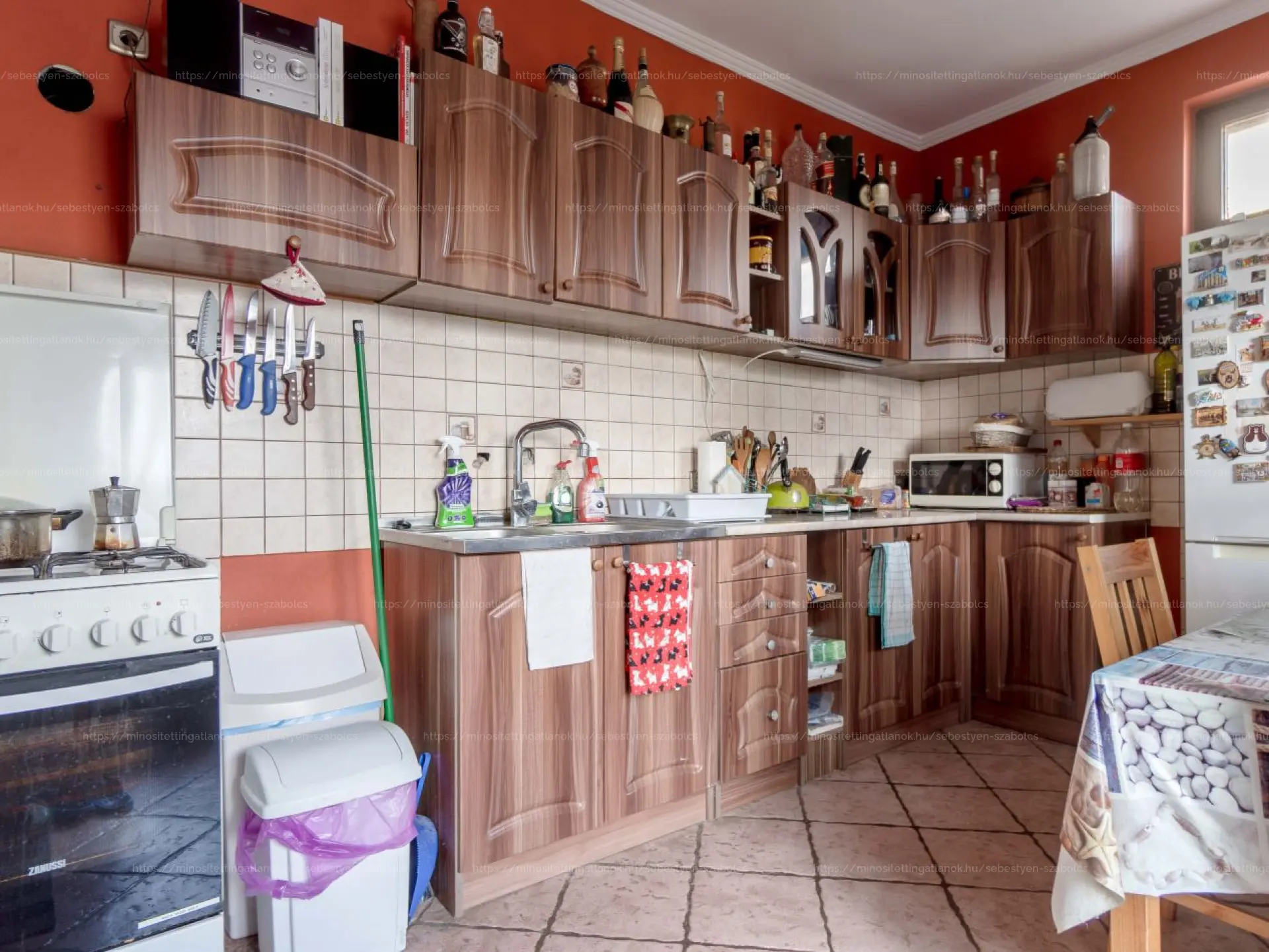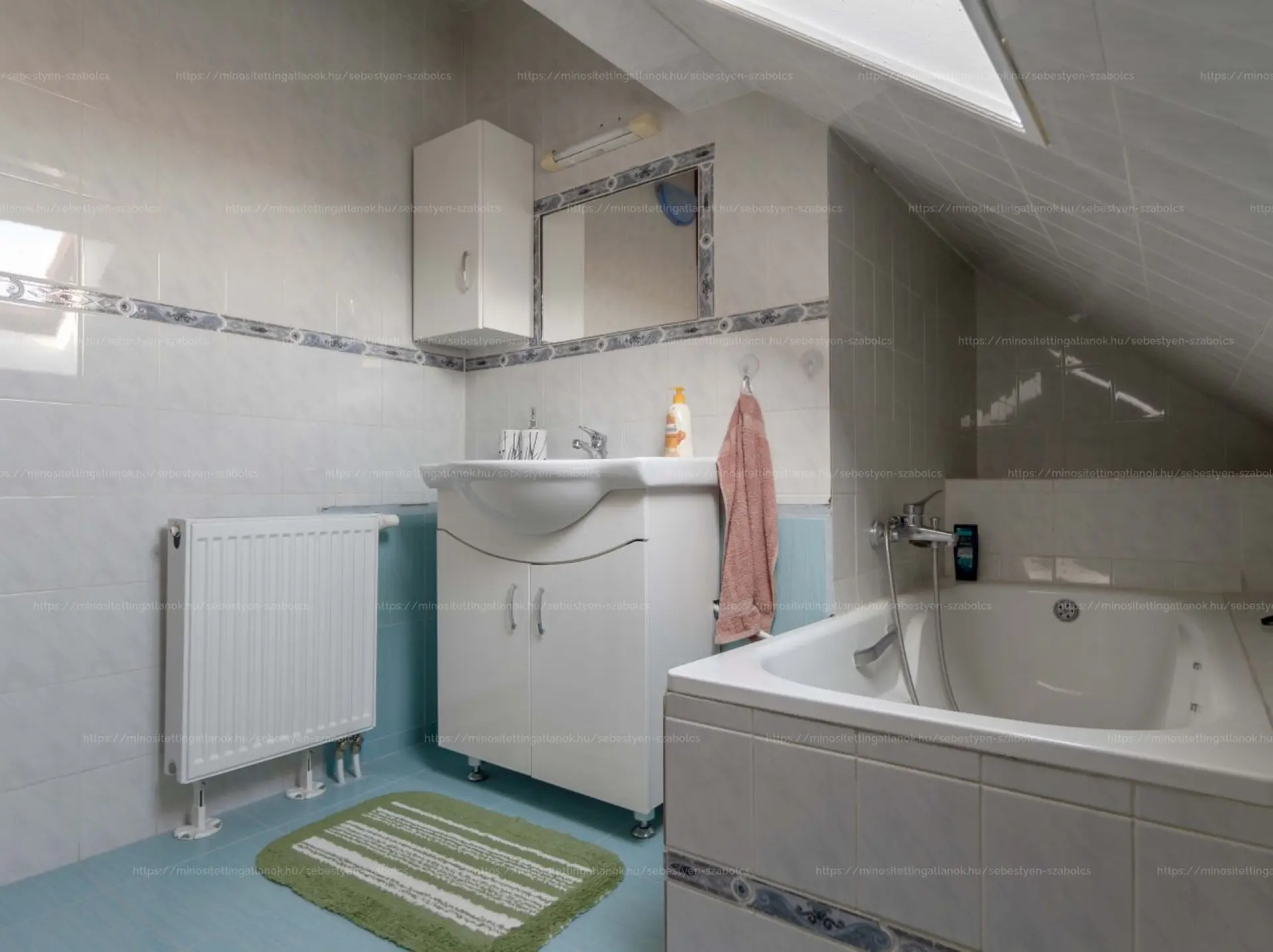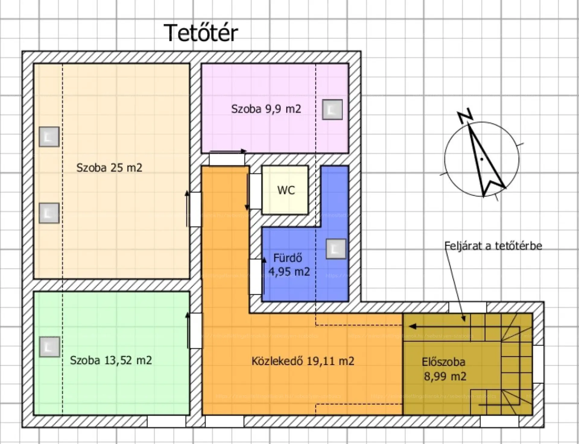 A tetőtér 75 m2. Itt 3 szoba, fürdő, wc és közlekedő található. Ahhoz, hogy önálló lakrészkét funkcionáljon, egy konyha kialakítása szükséges.