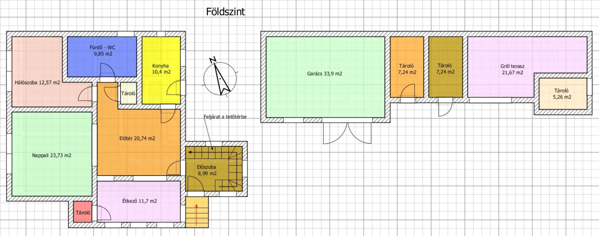 A lakóingatlanhoz 75 m2 melléképület tartozik, ami magában foglalja a 34 m2-es garázst, 2 tárolót és a fedett grill teraszt.