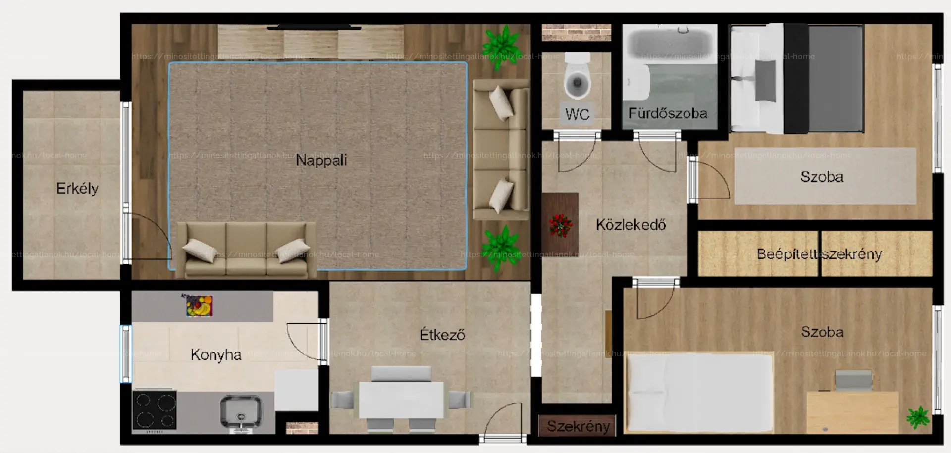 Kellemes hangulatú és remek tájolású: a nappali naplementében úszik a nyugati fekvésnek köszönhetően, a két háló kelet felé néz, így reggel természetes fényre ébredhetsz.