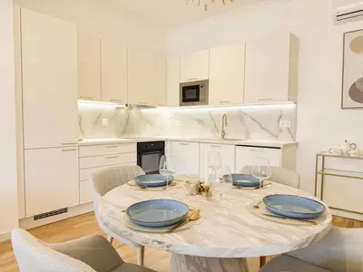 li,2 hálószoba, gépesített (mosogatógép, hűtőszekrény, sütő és főzőlap) konyha étkezővel, zuhannyal felszerelt fürdőszoba és külön WC található.