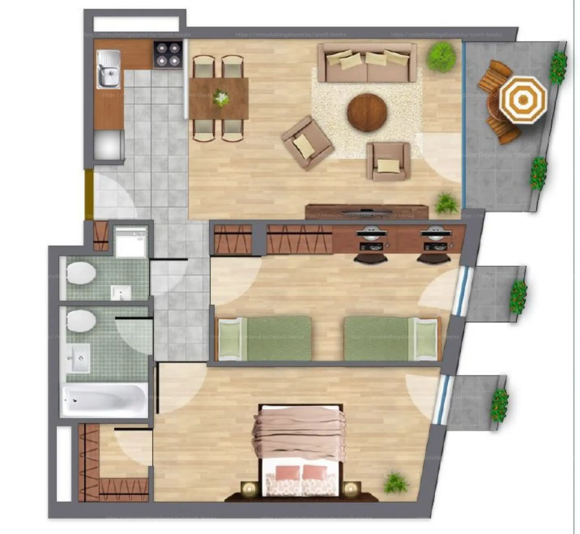 A 5,38 m²-es TERASZ és a 2 m²-es ERKÉLY ideális HELYSZÍN a PIHENÉSRE, FRISS LEVEGŐ élvezetére.