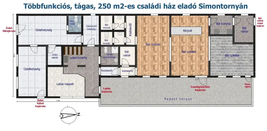 Az alaprajzon látható módon, az ingatlannak jelenleg 5 külső bejárata van. Az utolsó használat szerint a ház több funkciót látott el, jelenleg az ingatlanon belül van egy két bejáratos üzlet, egy kis lakás, valamint egy korábban vendéglátóhelyként üzemeltetett nagy egység, szintén két bejárattal.