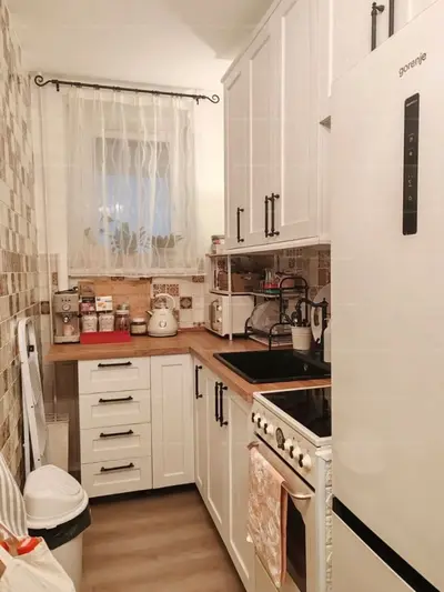 A lakás ablakos konyhával rendelkezik, nagy praktikuma a gardróbszoba.