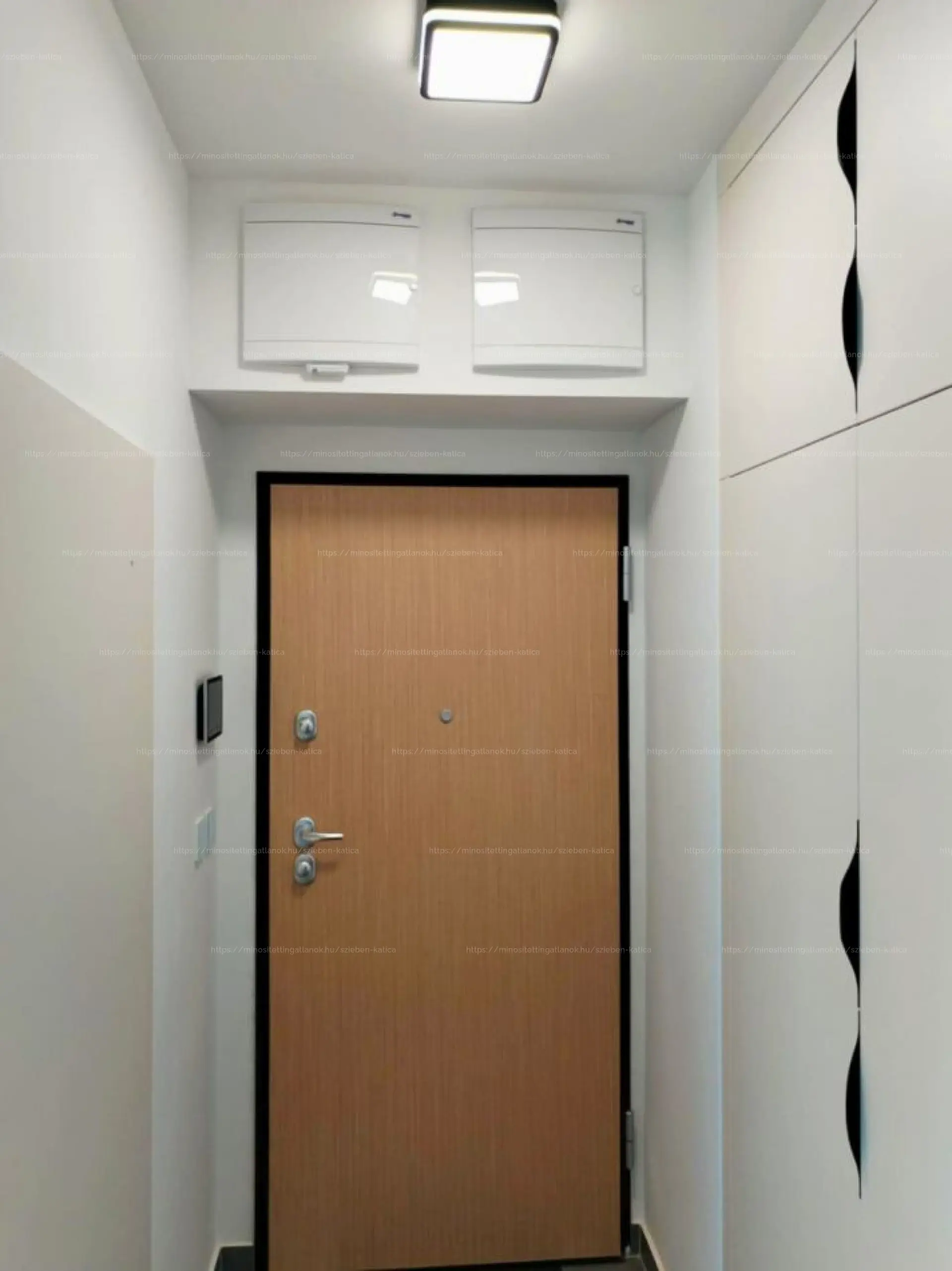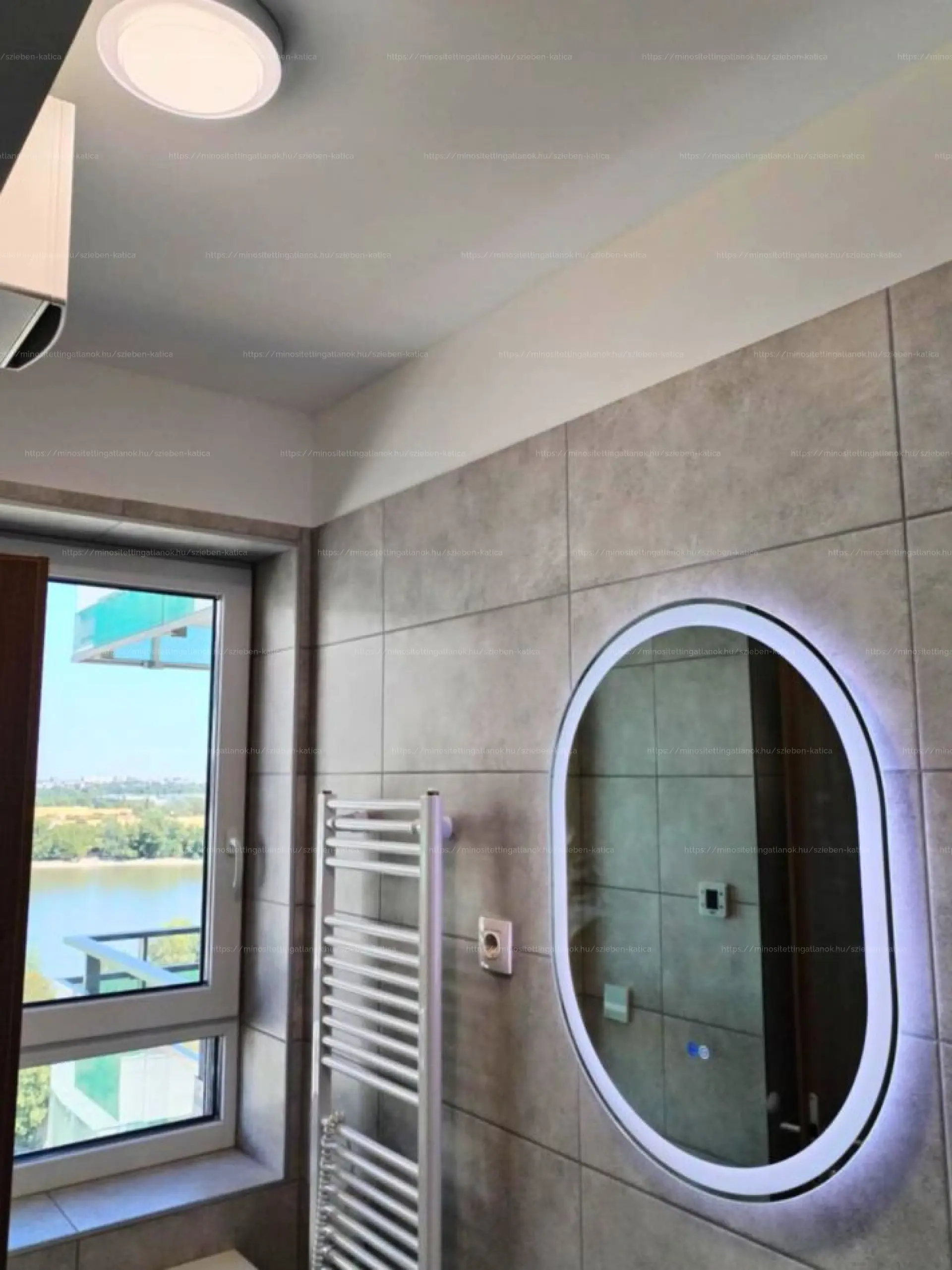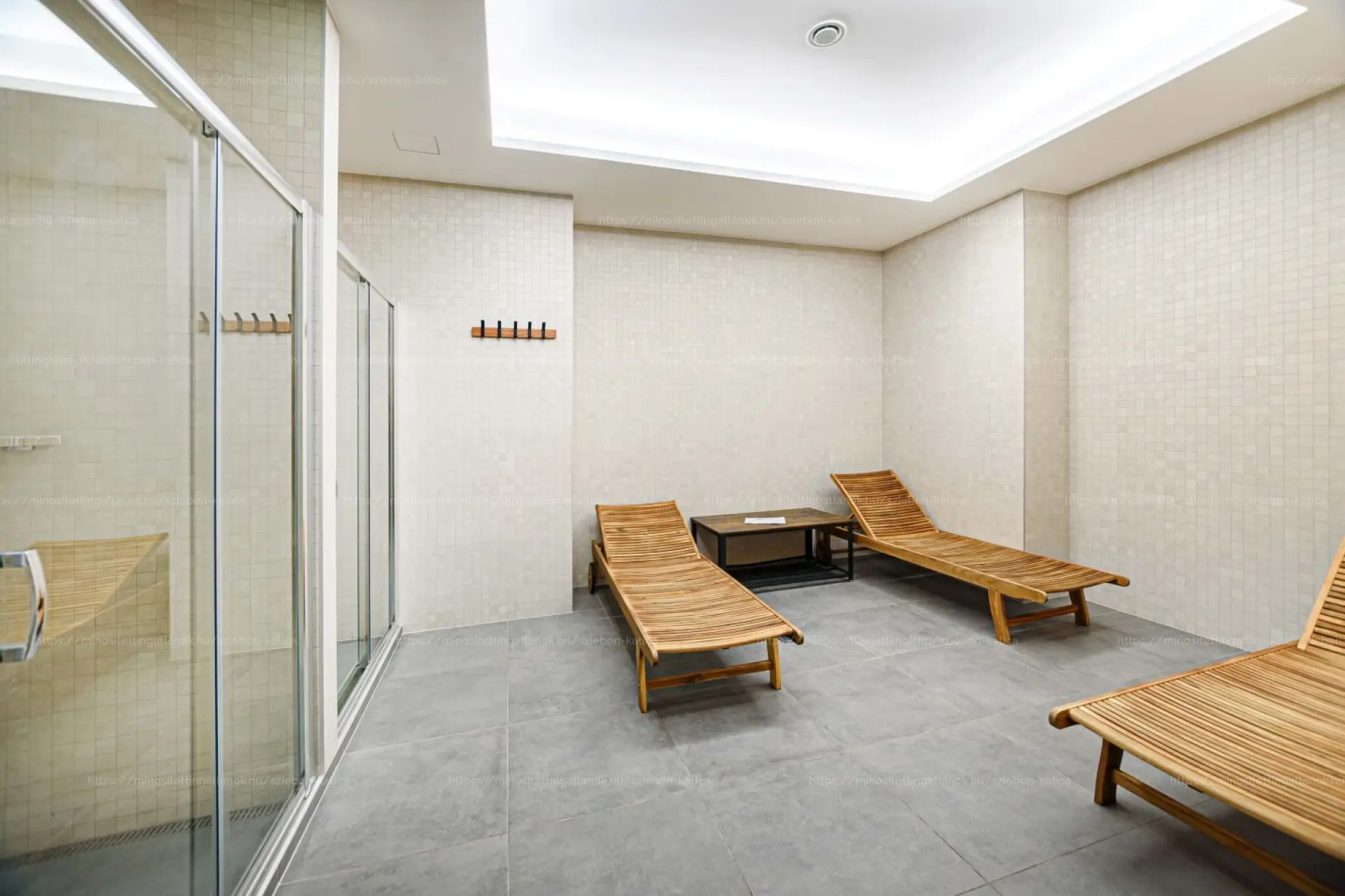 - Előszoba és fürdők: bútorozott, beépített tárolókkal, mosdószekrényekkel, tükrökkel és világítással felszerelve