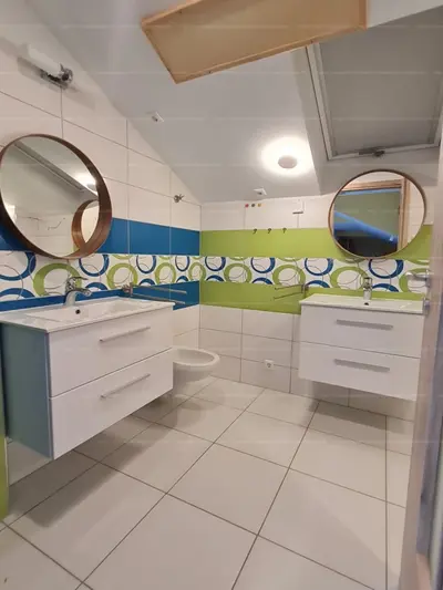 - felsőszint: 100 nm, ahol megtalálható: nappali, 3 hálószoba + 2 gardrób (egyik egyszemélyes, másik kétszemélyes), közlekedő, vidám és fiatalos színvilágú fürdőszoba (2 mosdó, zuhanyzó, WC, bide, piszoár, mosógép kiállás)