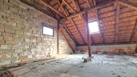 The flat plot is 636 square meters; the house was built with a ground floor and split-level design, featuring brick walls and reinforced concrete ceilings. The pitched roof is covered with tiles, and the attic space can be converted.