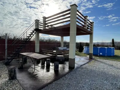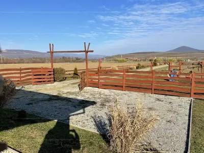 Az 5000 m2-es udvar rendezett körbe kerített, napozóterasszal, nyársalóval, nyári konyhával kiépítve.