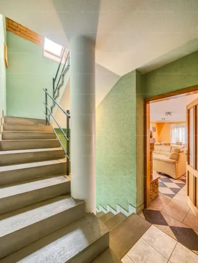 Az földszinten garázs, kazánház, és a hobbiszoba találhatók. Az emeleten tágas nappali étkezővel, vízteres kandallóval, erkélykapcsolattal, konyha, kamra és vendégmosdó található. A harmadik szinten három hálószoba, fürdőszoba, és a gardrób találhatók.