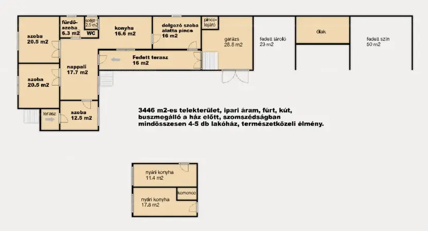 Az ingatlan részét képezi továbbá: Egy különálló k.b.: 30 m2-es, két helyiségből álló kemencével rendelkező épület, 29 m2-es garázs, k.b.: 10 m2-es pince, k.b.: 25 m2-es állattartásra alkalmas ólak, valamint egy 23 m2-es és egy 50 m2-es fedett tároló is.