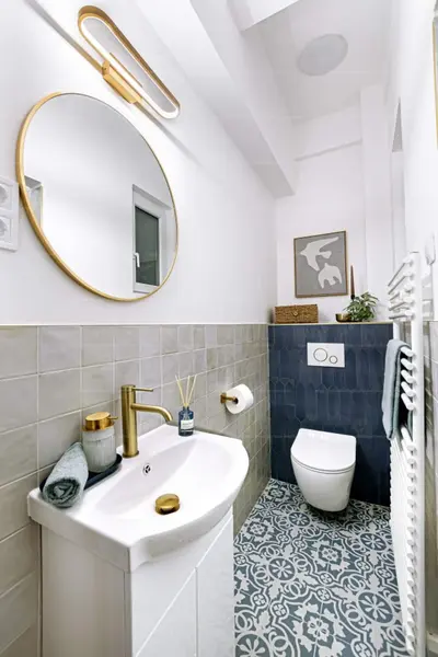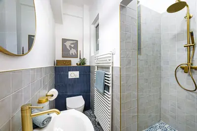 A frissen felújított, ablakos, zuhanyfülkés fürdőszoba új szaniterekkel, stílusos kialakítással várja az új tulajdonost.