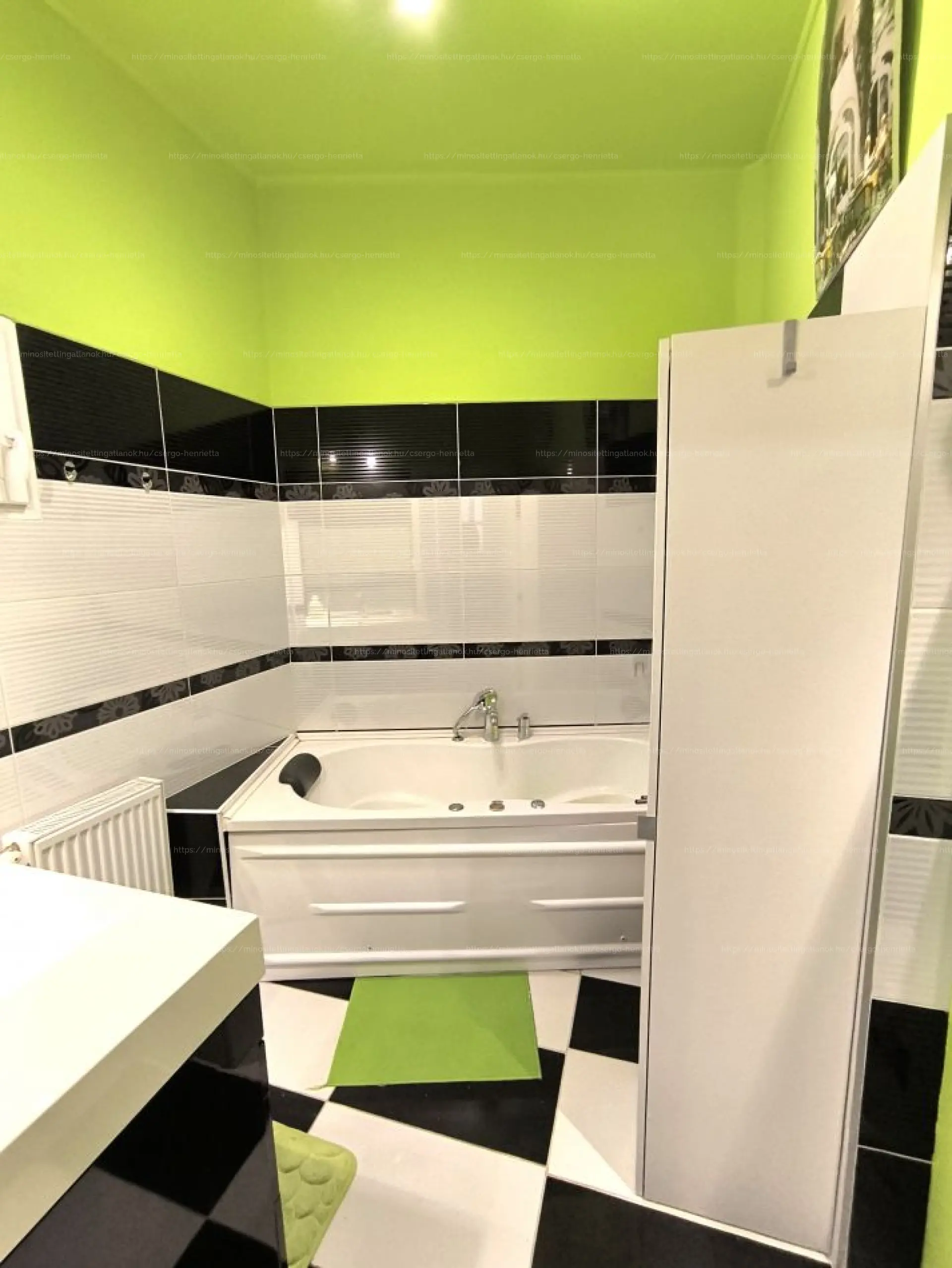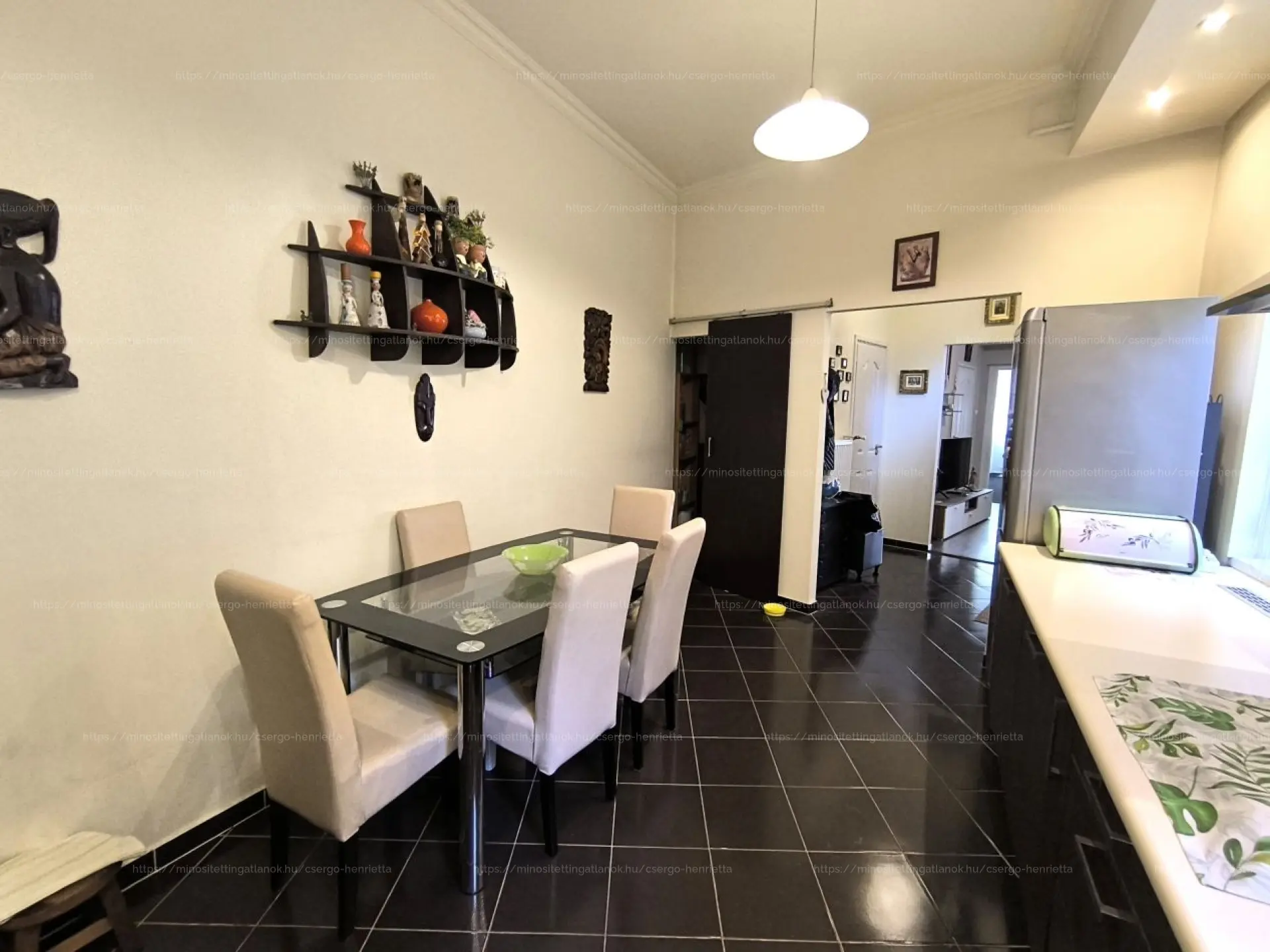A konyha teljesen felszerelt és gépesített: Gázfőzőlap, hűtőszekrény, mosogatógép, mosógép, beépített mikró és sütő, elszívó, mind a vételár részét képezik.