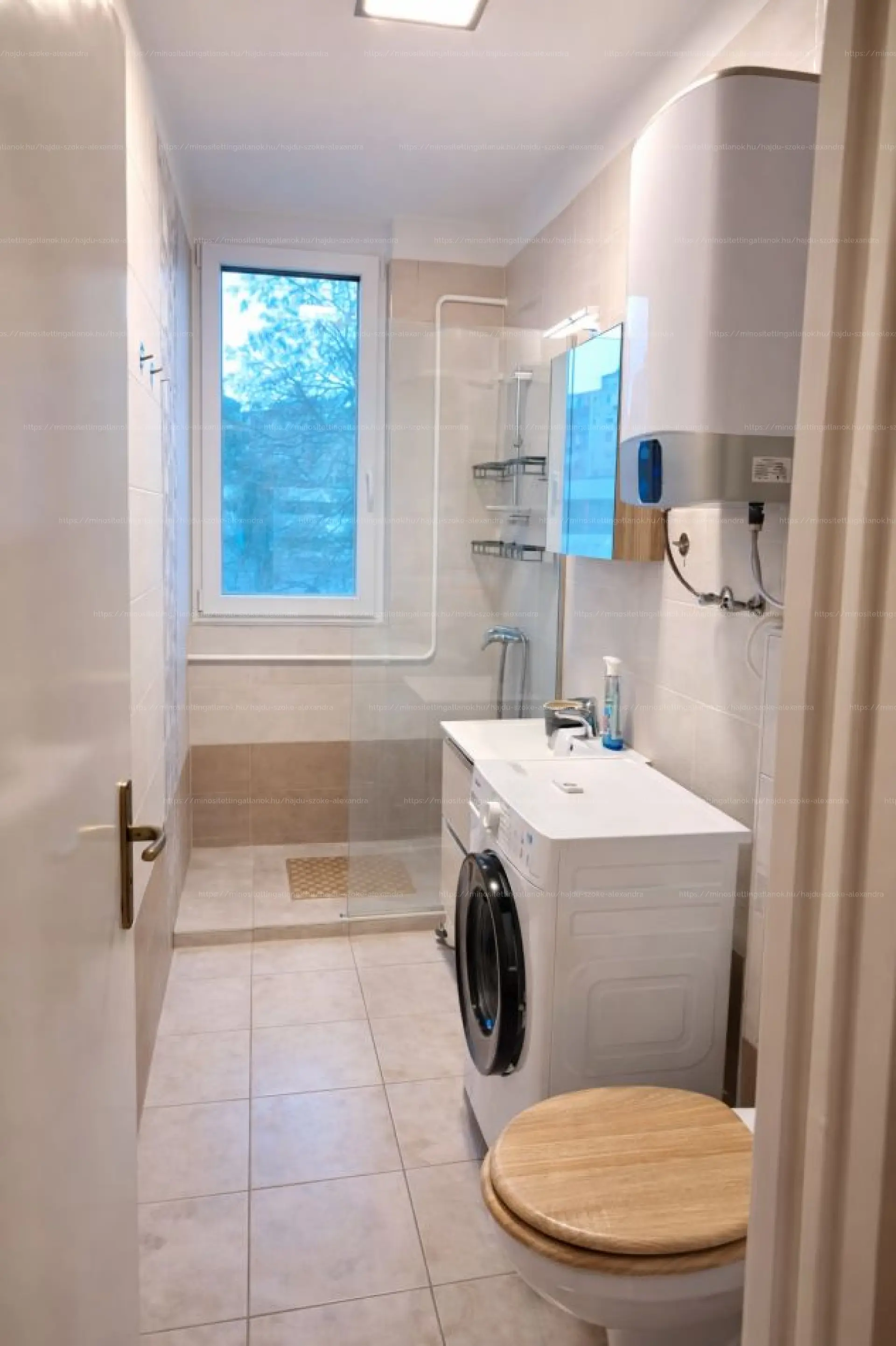 A konyha és a fürdőszoba szintén felújított állapotú, a lakás légkondi-val felszerelt, a fűtés gázkonvektorral és légkondi-val megoldott, így a rezsi alacsonyan tartható. A korszerű műanyag nyílászárók és az elektromos redőnyök növelik a komfortos, nyugodt lakókörnyezethez. A lakásban spájz és beépített tárolók is találhatók, amelyek fokozzák a praktikumot.