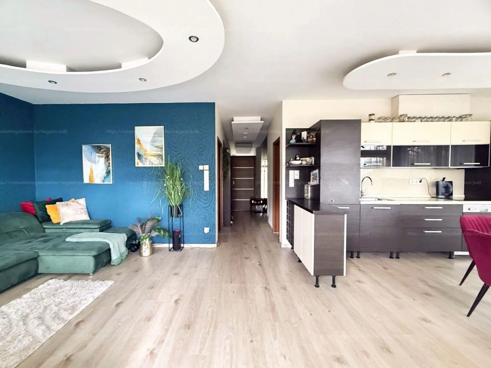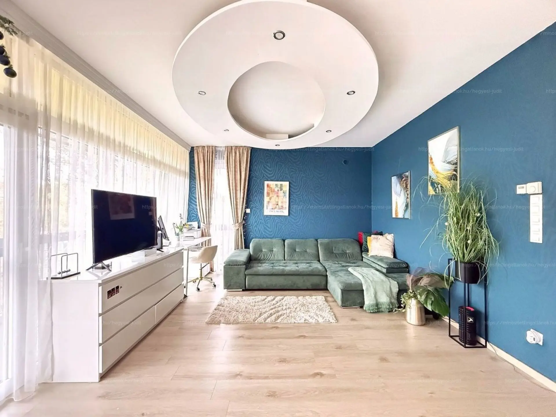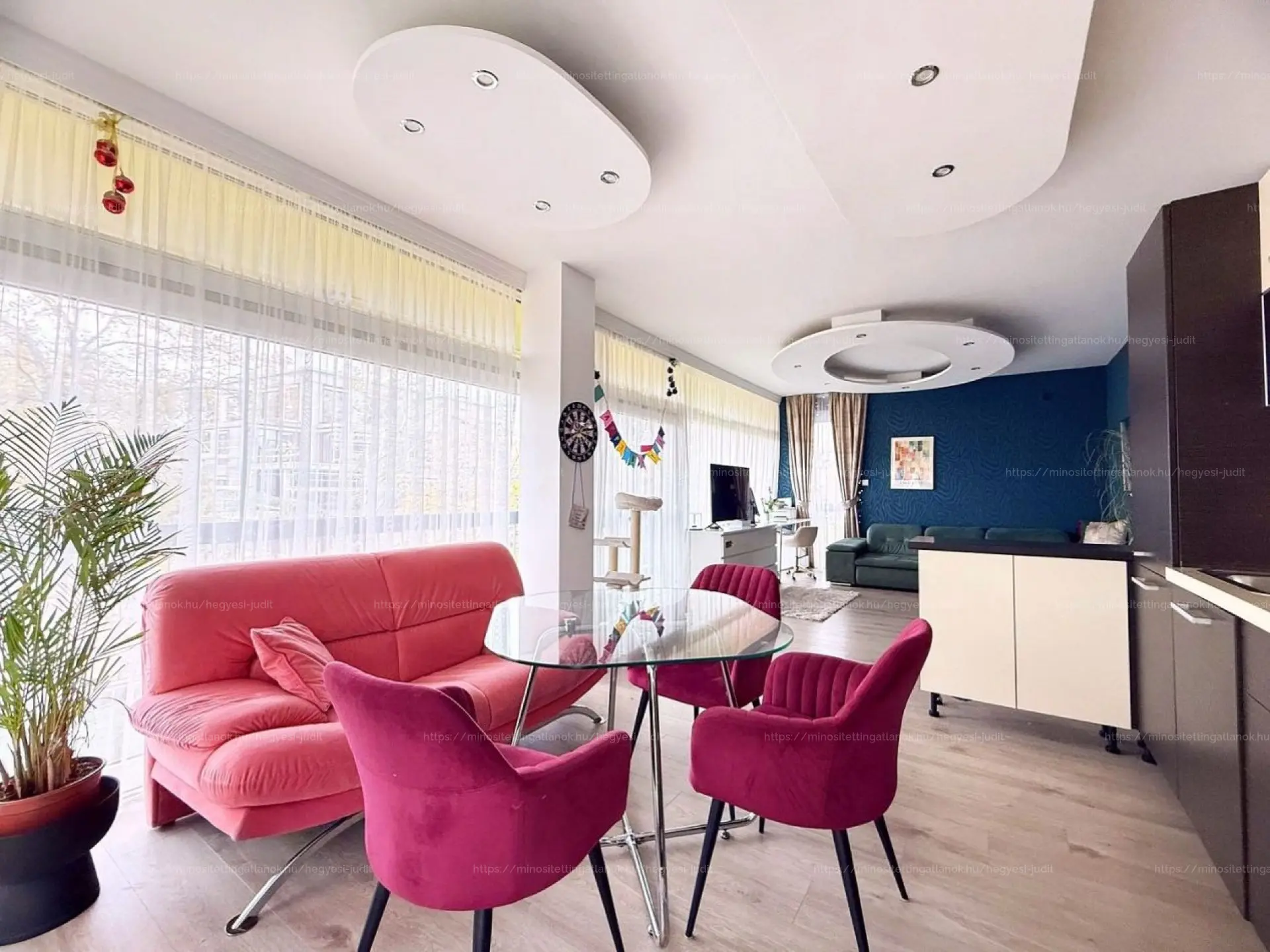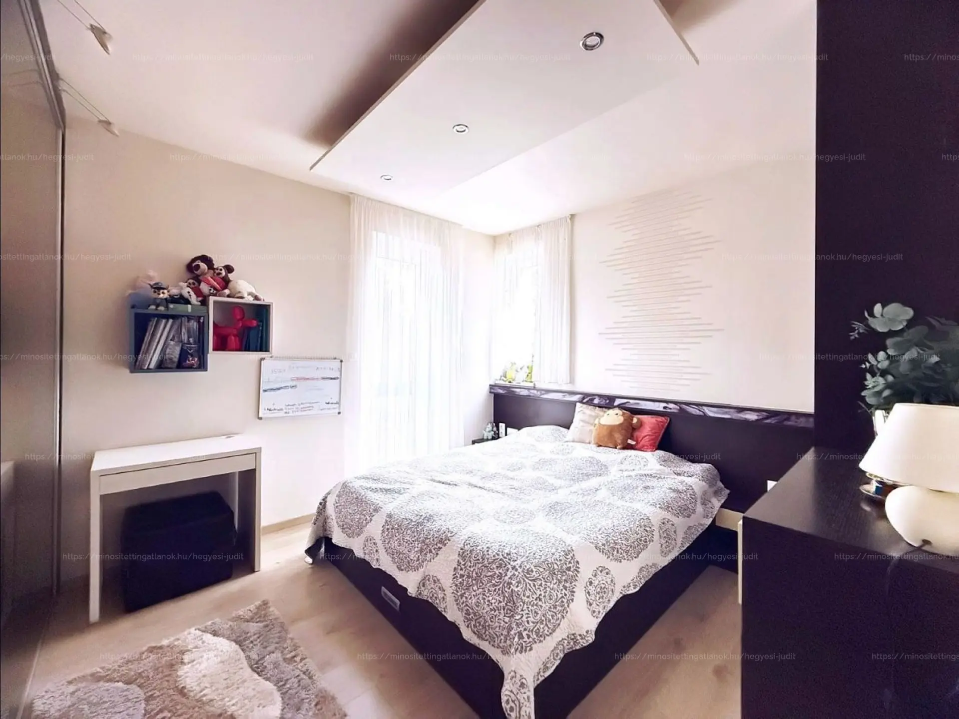 A tágas amerikai konyhás nappali két oldalról üvegfalas, teraszkapcsolatos; a hálókhoz franciaerkély, a fürdőszobához külön WC tartozik. A lakás igényes, azonnal költözhető, 2 fedett kocsibeállóval és 5,5 m²-es tárolóval.
