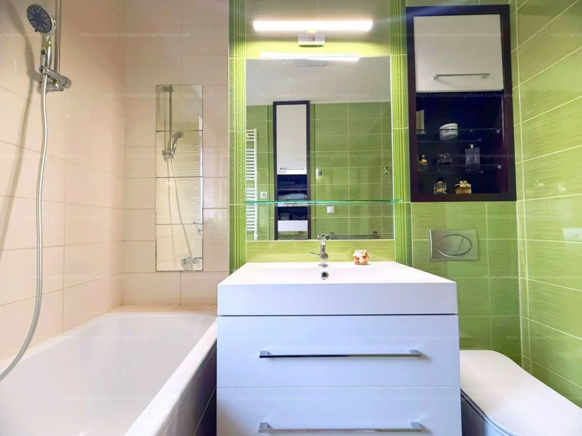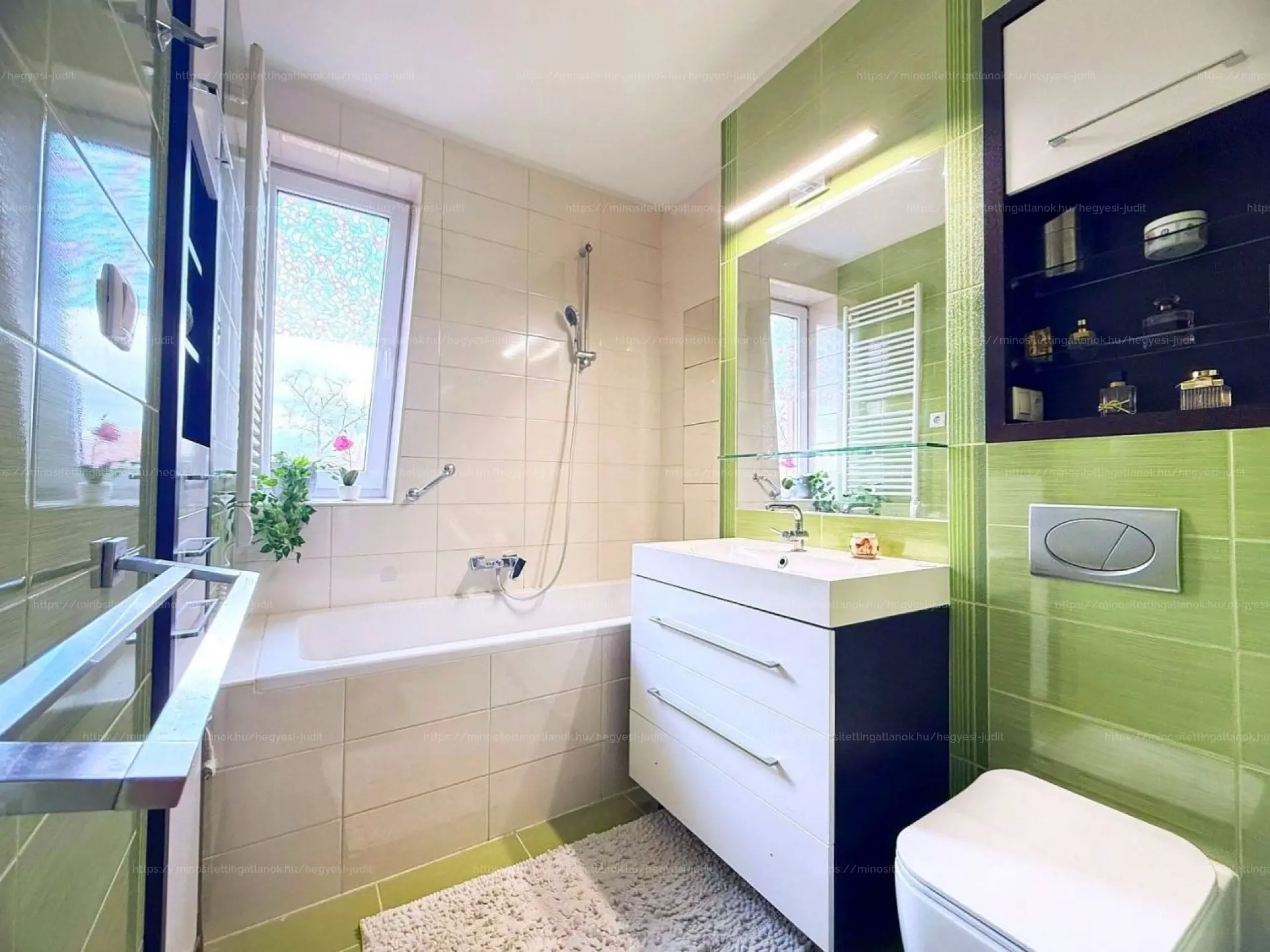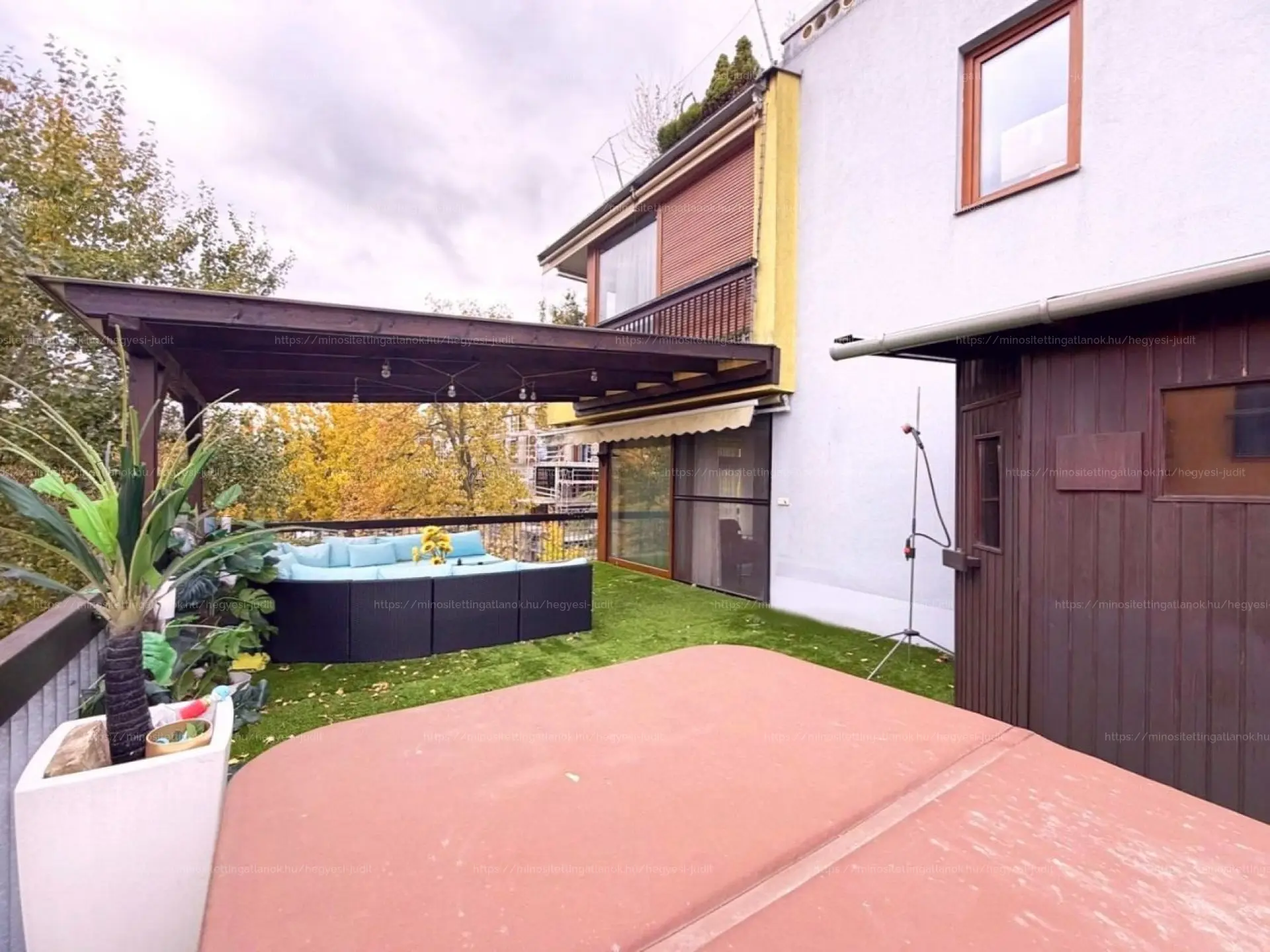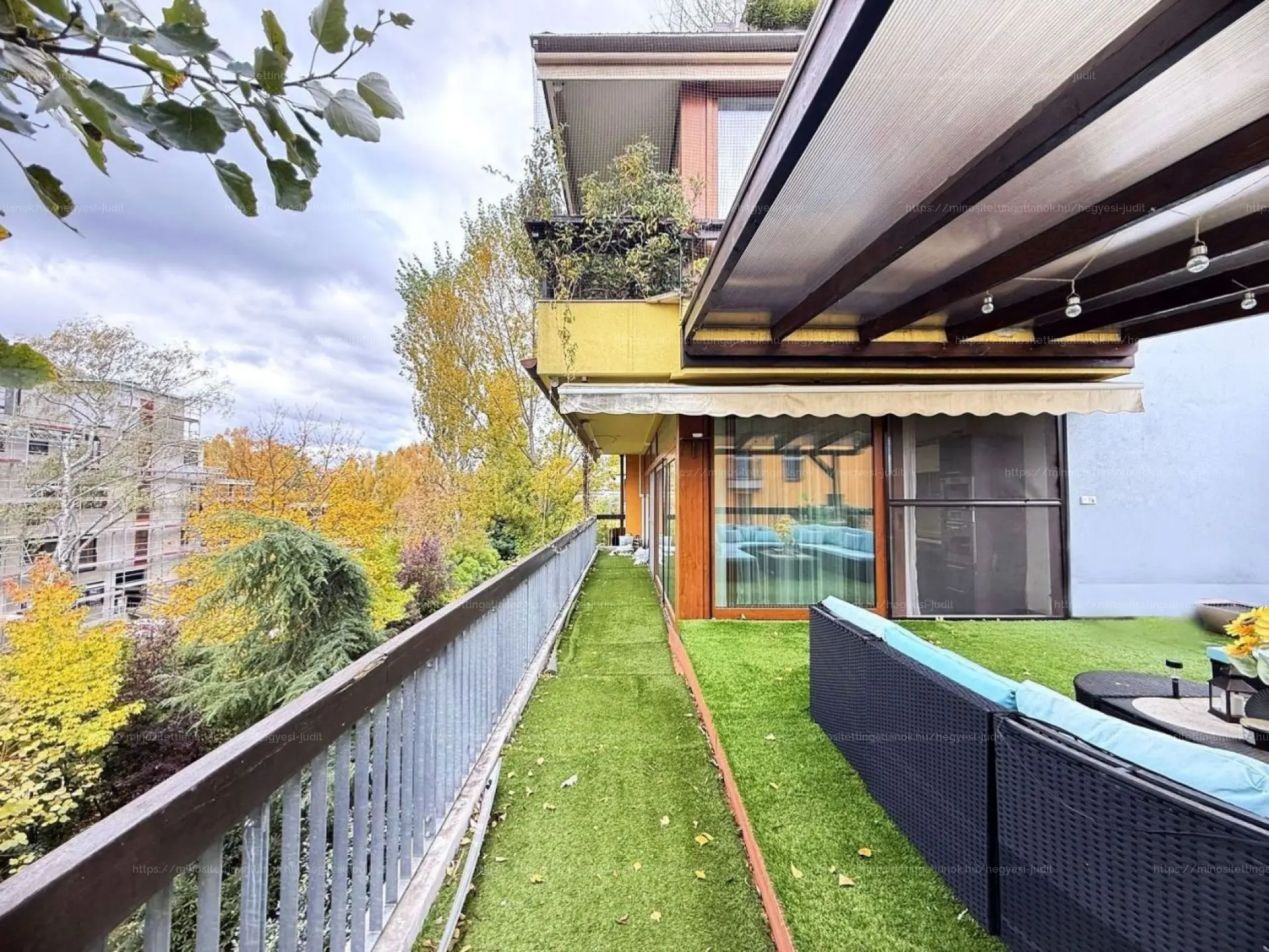 A tágas amerikai konyhás nappali két oldalról üvegfalas, teraszkapcsolatos; a hálókhoz franciaerkély, a fürdőszobához külön WC tartozik. A lakás igényes, azonnal költözhető, 2 fedett kocsibeállóval és 5,5 m²-es tárolóval.