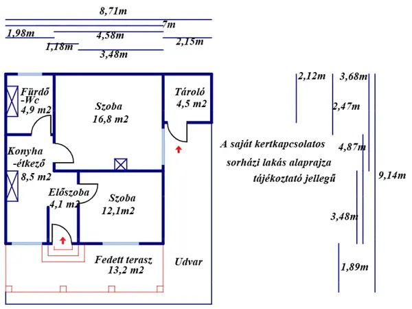 A komfortos földszintes lakásban két szoba, egy konyha, egy fürdőszoba-WC helyiség, egy előszoba, egy külső tároló és egy 13 m2-es fedett terasz kis parkosított udvarral kapott helyet. A sorház beton alapon tégla falazattal épült, víz ellen szigetelt, száraz. A homlokzat jó állapotú vakolt, igény szerint hőszigetelésre, kőporozásra vár. A födém fa szerkezetű, szigetelt és gipszkartonnal borított. A tetőszerkezet fából készült, jó állapotú, masszív, bakdúccal és székállással készült, beázástól mentes. Héjazata égetett cserepezést kapott, körben csatornával ellátott. A lakás helyiségei laminált padló- és járólap burkolatot kaptak. A külső nyílászárók hőszigetelt műanyagok, redőnnyel és szúnyoghálóval ellátottak. A belső ajtók jó állapotúak, normál fa szerkezetűek. Az összközműves ingatlanban az egyfázisú villany (16 Amper), a vezetékes víz, a csatorna, és a gáz rendelkezésre állnak. A lakás biztonsági kamera rendszerrel ellátott. Az otthon melegéről helyiségenként gázkonvektor gondoskodik, a melegvíz ellátás villanybojlerrel biztosított. Az udvar rendezett, körben bekerített. Gépjárművek számára a földes zsákutcában a lakás előtt, közvetlen parkolás lehetséges. Aszfaltos út 50 méterre elérhető. A város infrastruktúrája pár perces autóúttal elérhető, a tömegközlekedés kiépített. A hirdetés tájékoztató jellegű, az ingatlanról pontos adatokat a megtekintést követően a tulajdonos által elmondottak alapján tudunk garantálni! Az ingatlan jelenleg is lakott, birtokba adás megegyezés szerint lehetséges, vétel esetén a lakás komplett bútorzata kiürítésre kerül. A vásárlás finanszírozásában az OTP kedvezőbb kamatozású hitelkonstrukcióival tudunk segíteni. Az adásvételi szerződés lebonyolításához korrekt ügyvédi közreműködést tudunk ajánlani. Amennyiben felkeltettem érdeklődését, hívjon bizalommal!
