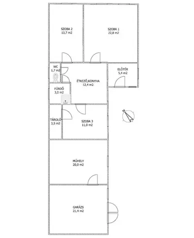 3 szoba, konyha + étkező, fedett előtér, fürdőszoba, wc, tároló és garázs