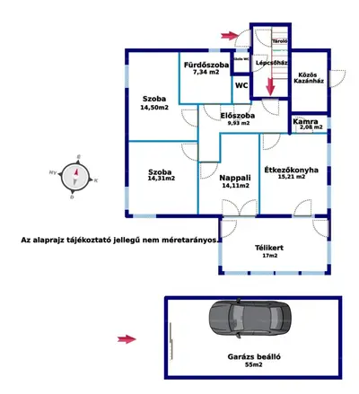 A jelenlegi elrendezés egyszerűen átalakítható. Egy válaszfal kibontásával akár egy nagy, 30 nm-es amerikai konyhás nappalit is KIALAKÍTHAT.