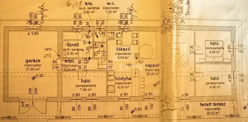 Fa födémmel, betonkoszorúval, cserép fedéssel és 3 fázisú, 32 Amperes hálózattal bír.