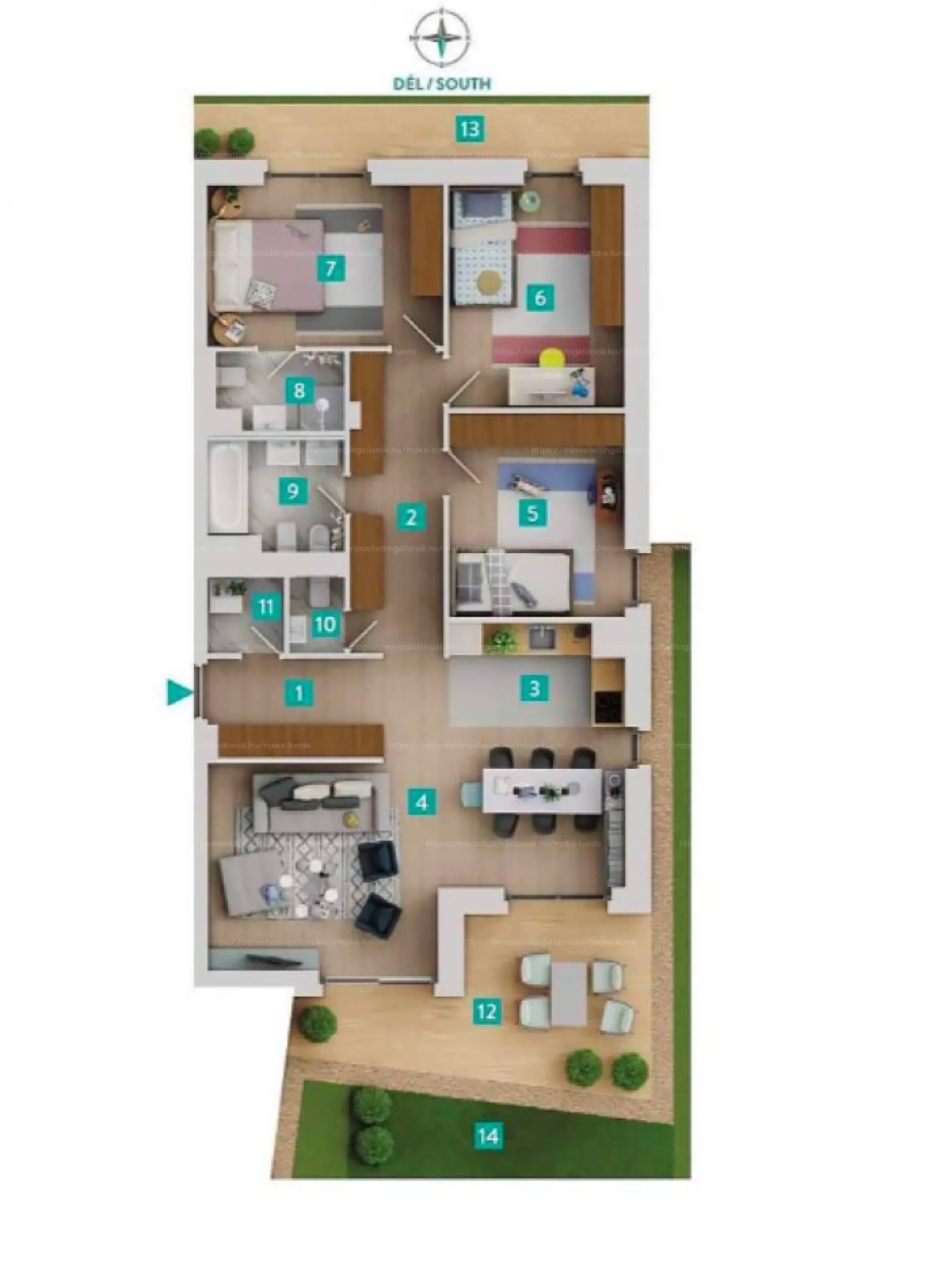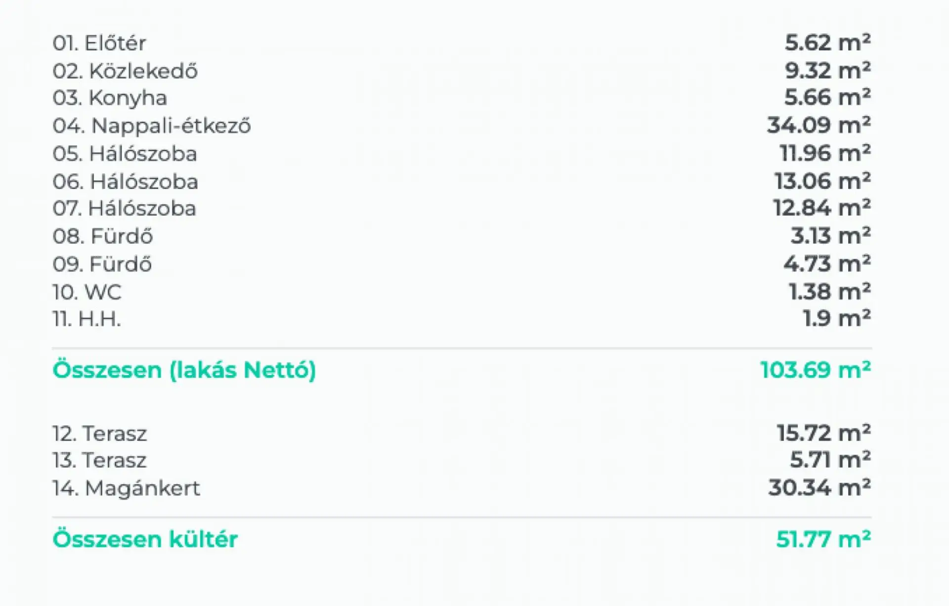 A lakás helyiségei: előtér, közlekedő, konyha, nappali-étkező, 3 hálószoba, 2 fürdő, WC, háztartási helyiség, 2 erkély, magánkert