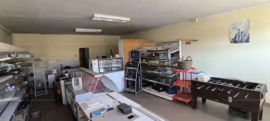 Helyiségek: üzlettér 55,7 m², presszó 24,5 m², két WC, kazánház, tároló, fedett terasz.