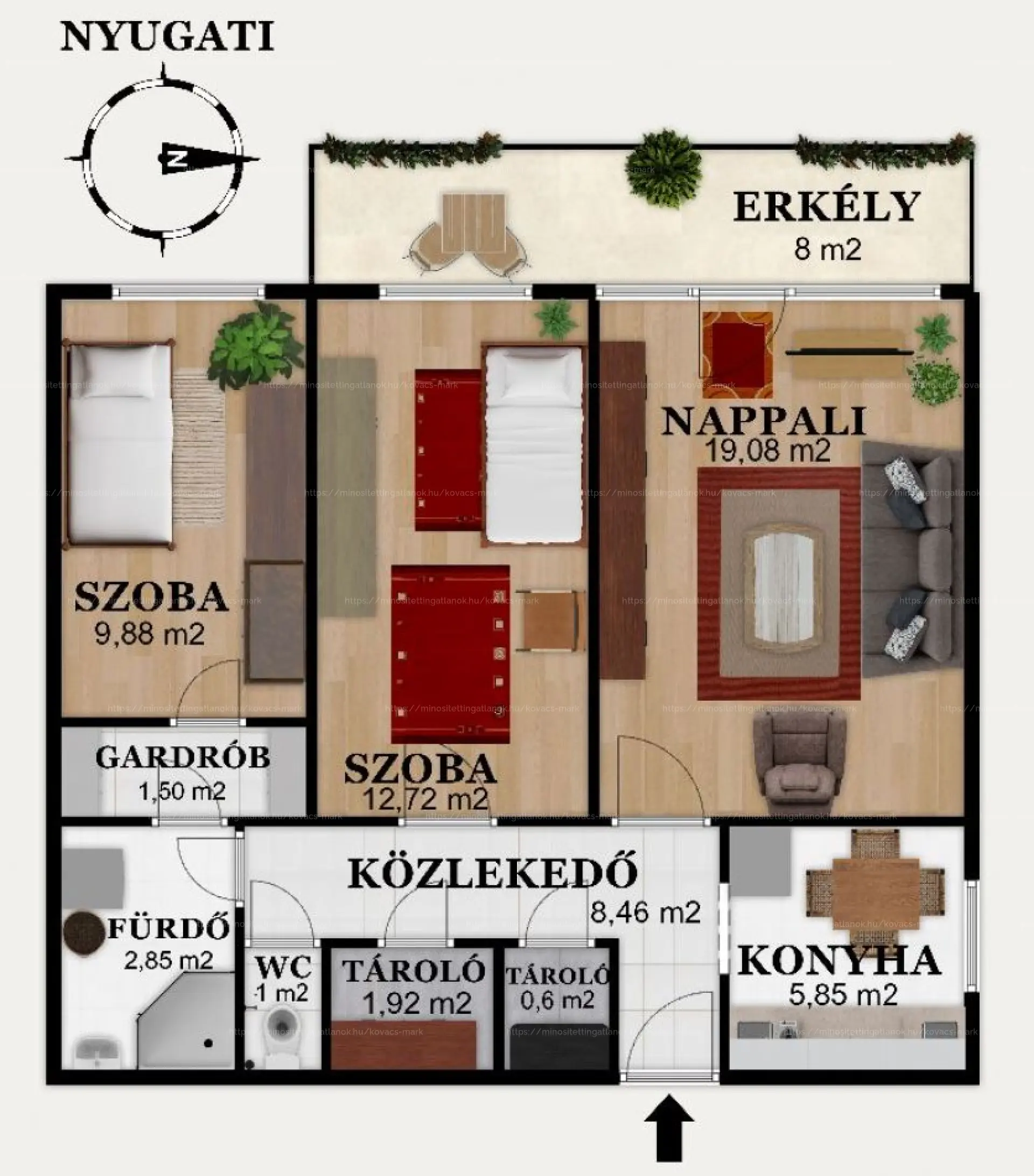 Előszoba, közlekedő étkezős konyha, nappali, 2 különnyíló hálószoba, zuhanyzós fürdőszoba,Wc 2db kamra, terasz.