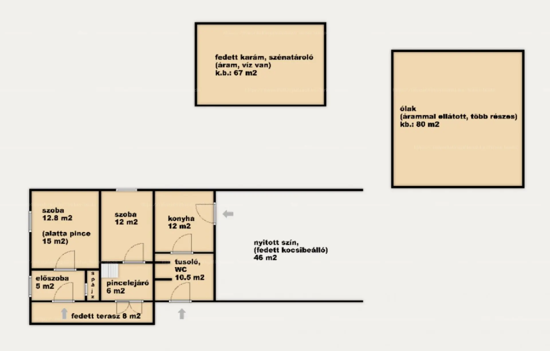 Az ingatlanegyüttes részét képező, több mint 2 ha-os területen, állattartásra is alkalmas ólak, szénatároló, valamint gyümölcsfák is vannak.