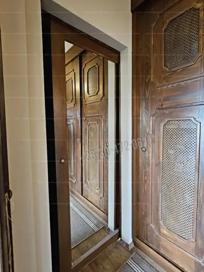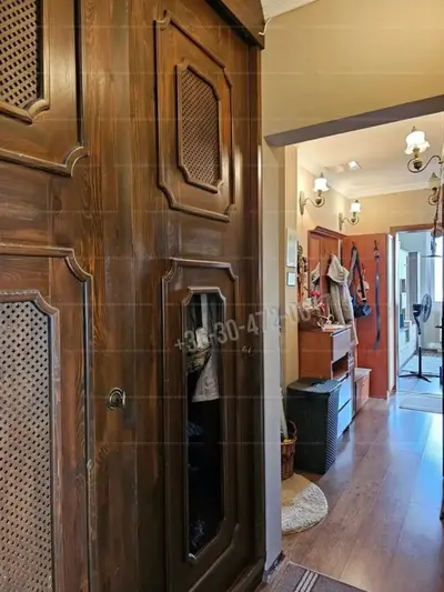 A konyhaszekrény és az előszobai gardróbszekrény fából készült. A vételár tartalmazza a mennyezeti lámpákat is.