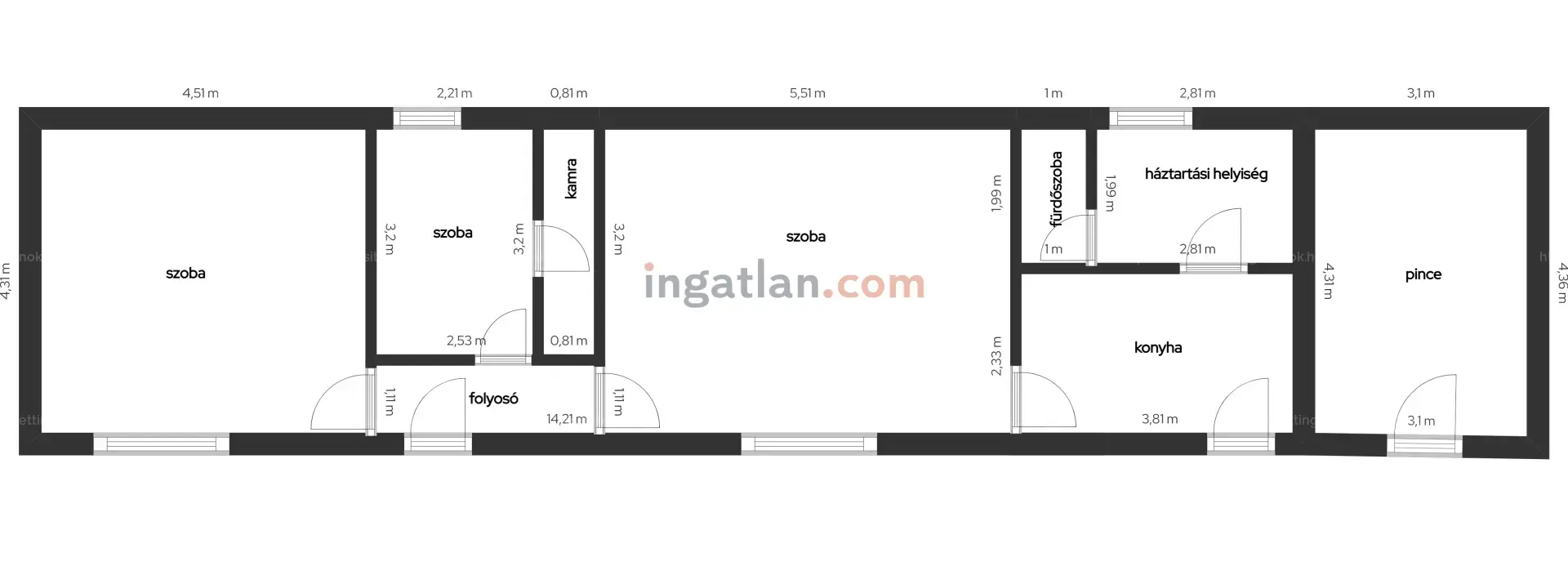 • Konyha, spejz, fürdő + WC, tároló, közlekedő