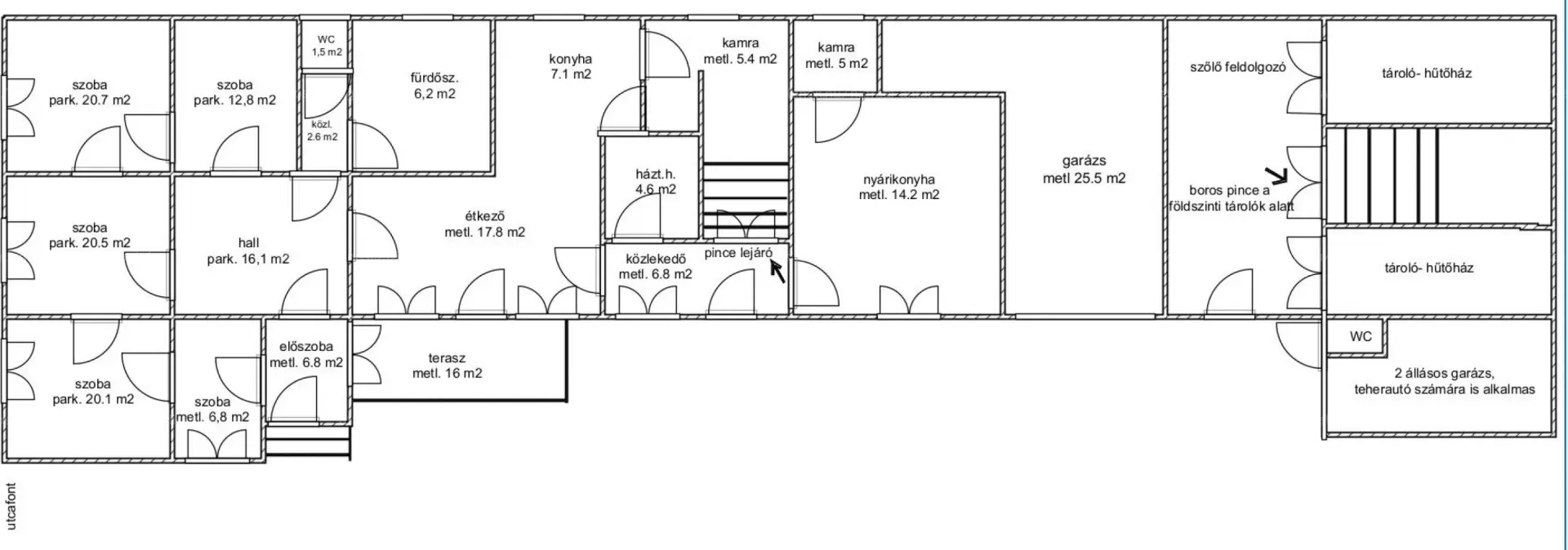 A lakóépület folytatásában, összesen 220 m2-en, a korábbi használat szerinti tágas szőlő feldolgozó helyiség, 2 hűtő tároló, valamint a tárolók alatt nagy méretű boros pince lett kialakítva. Továbbá 2 állásos, avagy teherautó beállására is alkalmas garázs.