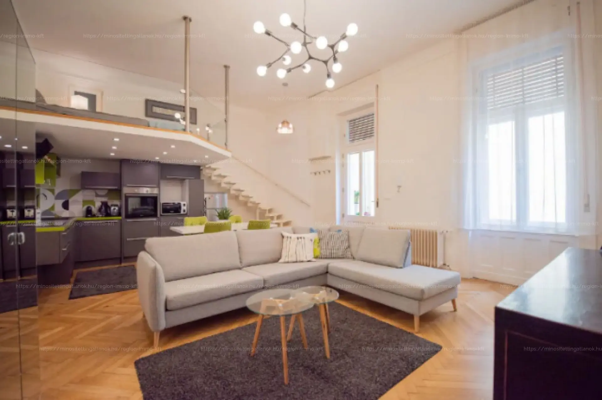 2.) lakás, 61 nm, 1 háló szoba, amerikai konyhás nappali, fürdő szoba, galéria.