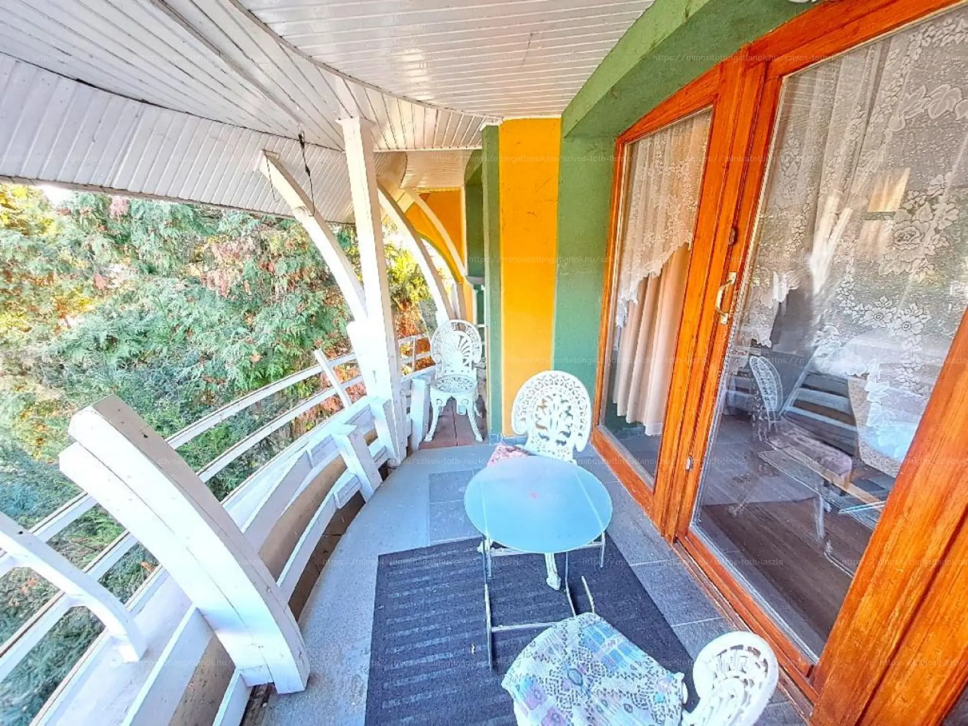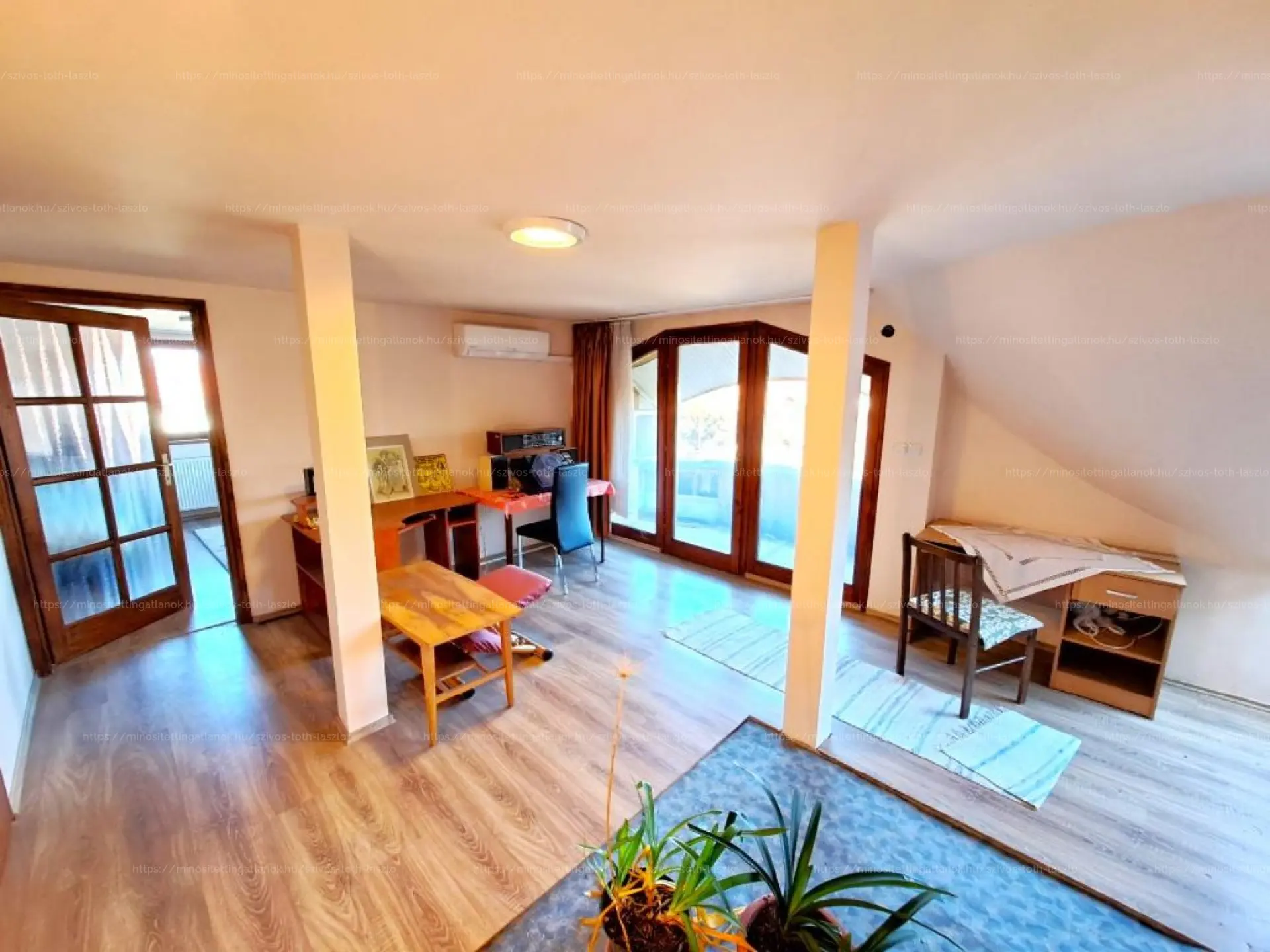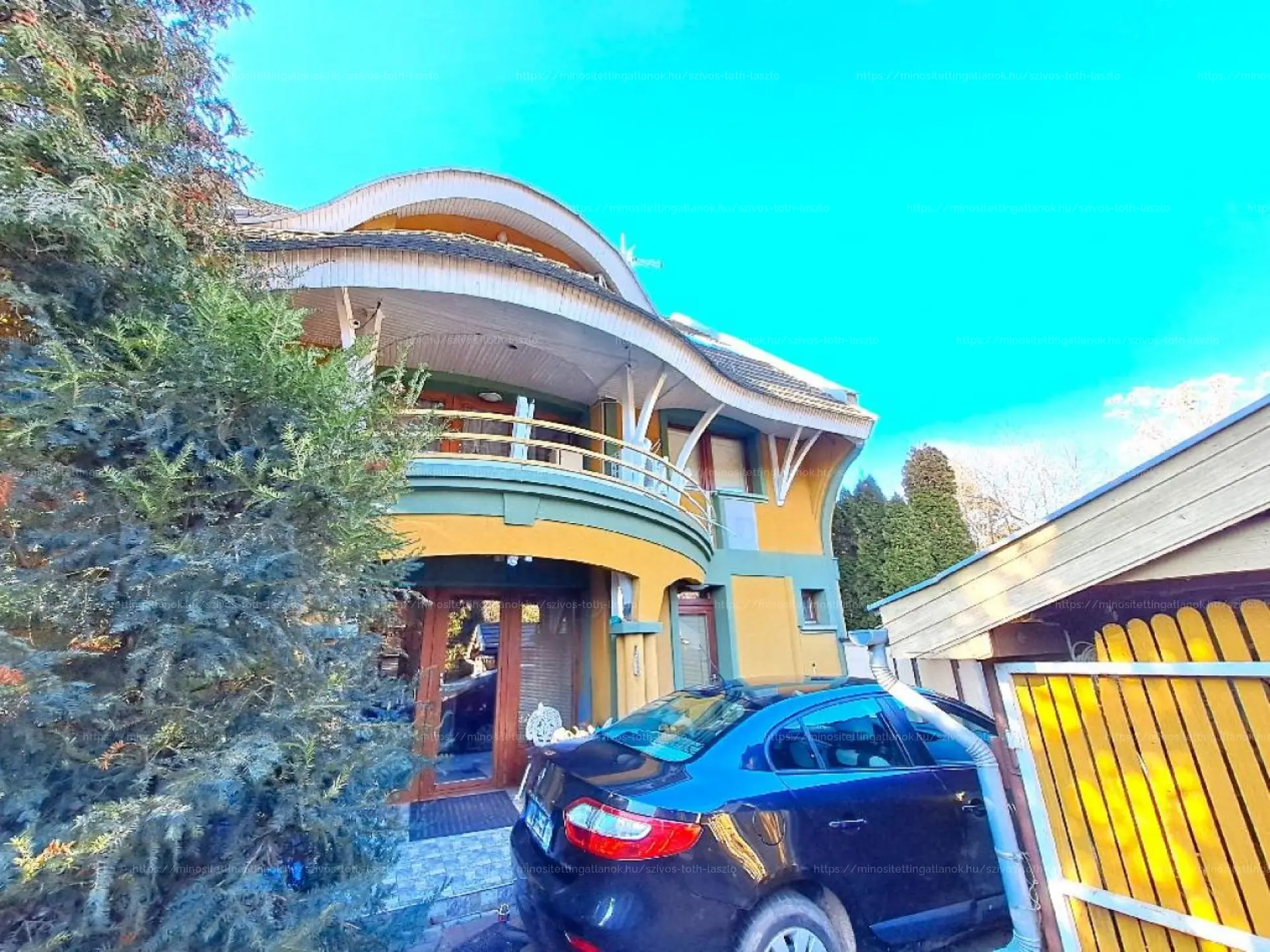 Az 1994-ben épült összkomfortos ingatlan földszintjén egy nappali, két szoba, egy előszoba, három külön nyíló WC-helyiség és két fedett terasz kapott helyet. Az első emeleten egy nappali, két szoba, egy fürdőszoba-WC helyiség, egy konyha, egy loggia, egy francia erkély és egy fedett loggia található. A harmadik tetőtéri szinten egy nappali, két szoba, egy fürdőszoba-WC helyiség és egy fedett erkély került kivitelezésre.