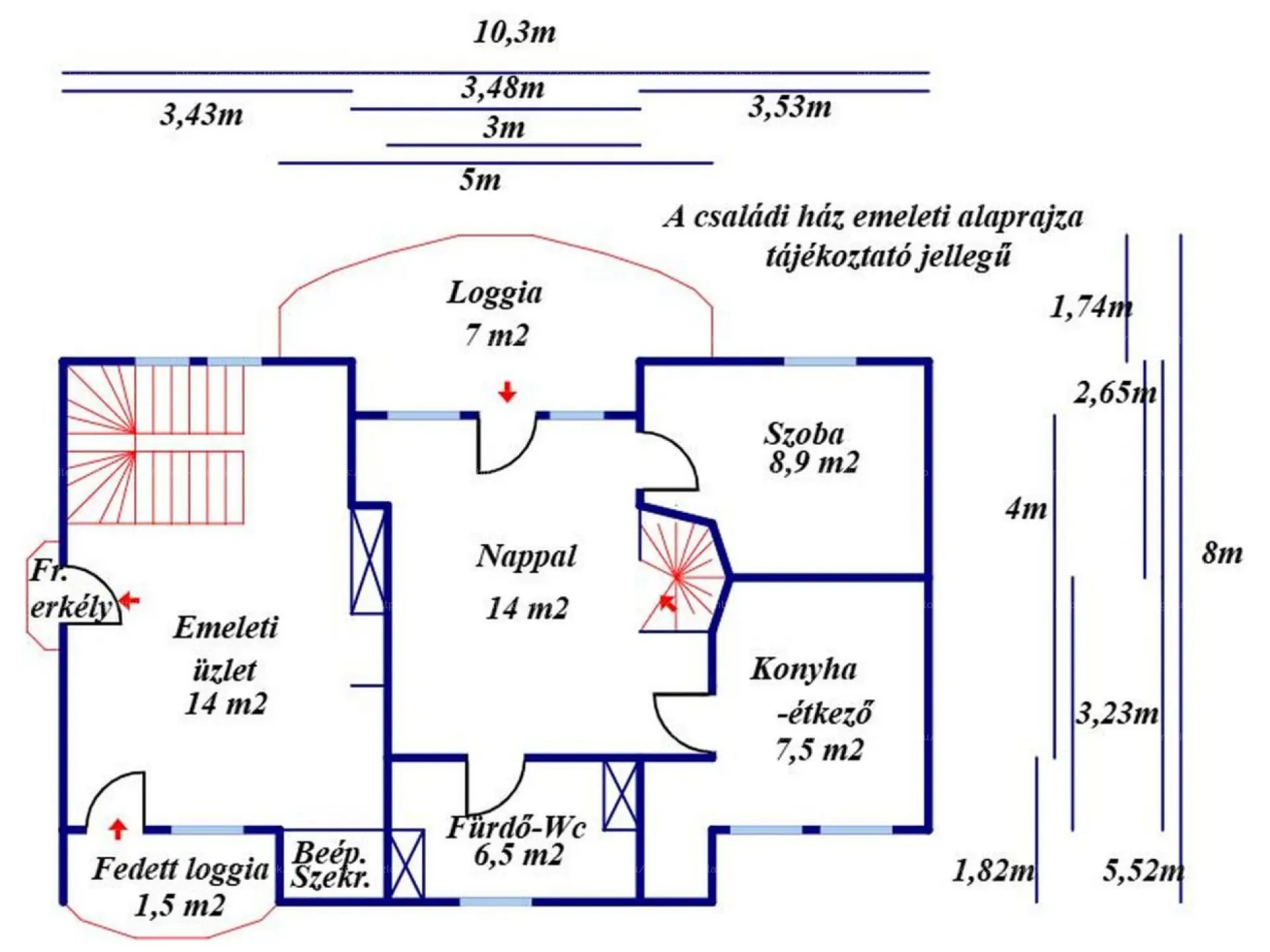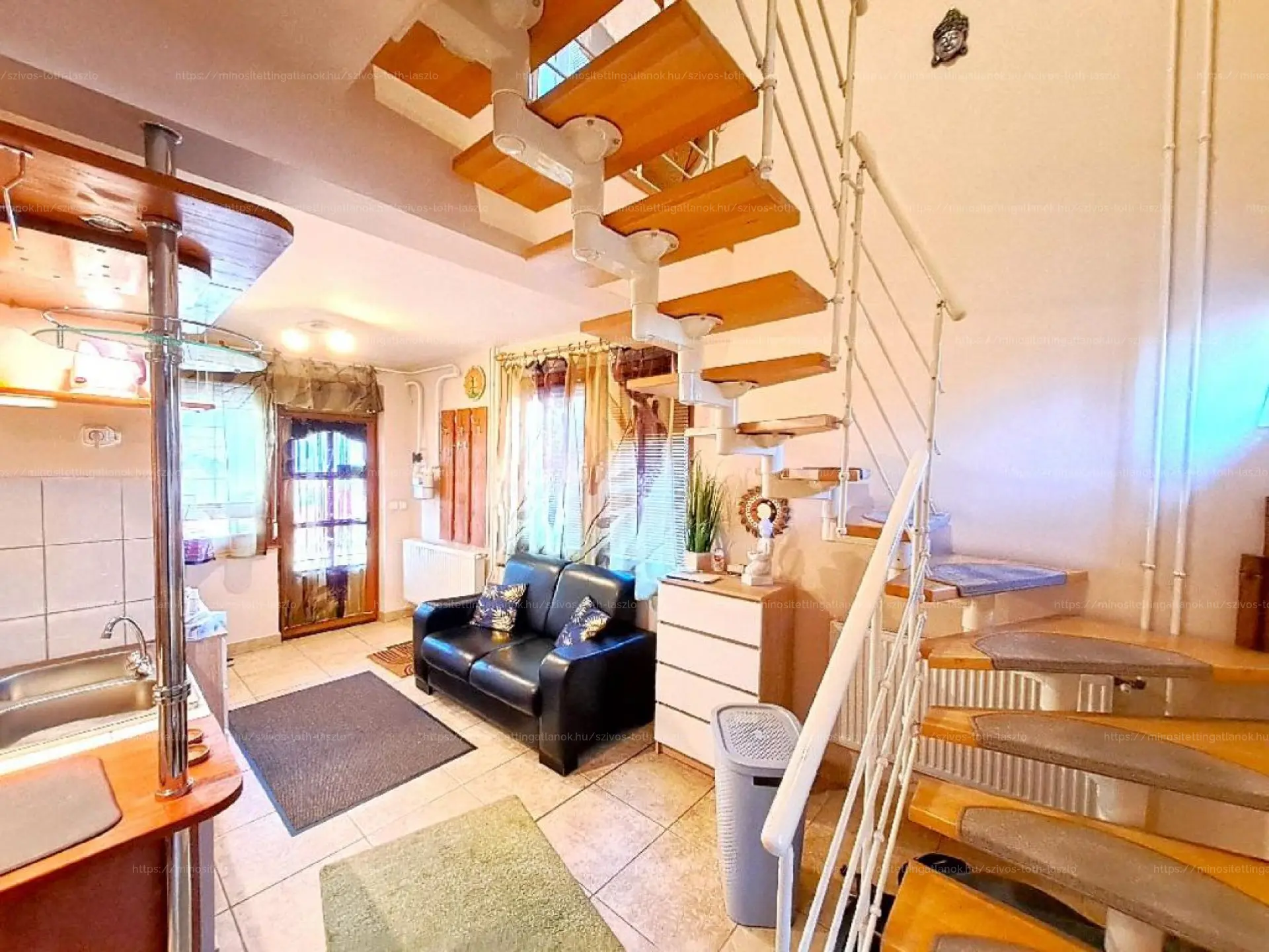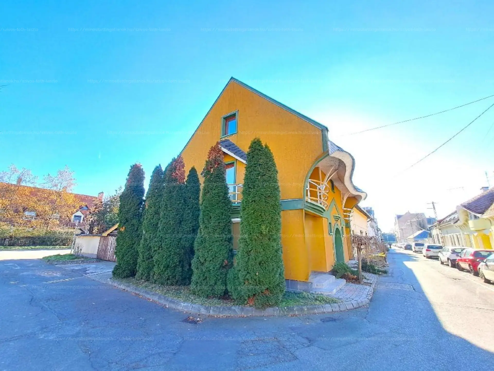 Az 1994-ben épült összkomfortos ingatlan földszintjén egy nappali, két szoba, egy előszoba, három külön nyíló WC-helyiség és két fedett terasz kapott helyet. Az első emeleten egy nappali, két szoba, egy fürdőszoba-WC helyiség, egy konyha, egy loggia, egy francia erkély és egy fedett loggia található. A harmadik tetőtéri szinten egy nappali, két szoba, egy fürdőszoba-WC helyiség és egy fedett erkély került kivitelezésre.