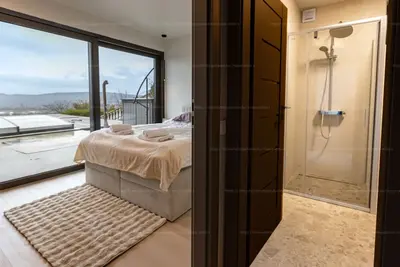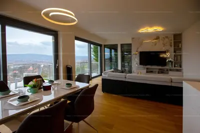 Tágas amerikai konyhás nappali hatalmas, panorámás terasszal, 2 hálószoba, elegáns fürdőszoba, külön mosdó és impozáns előtér.
